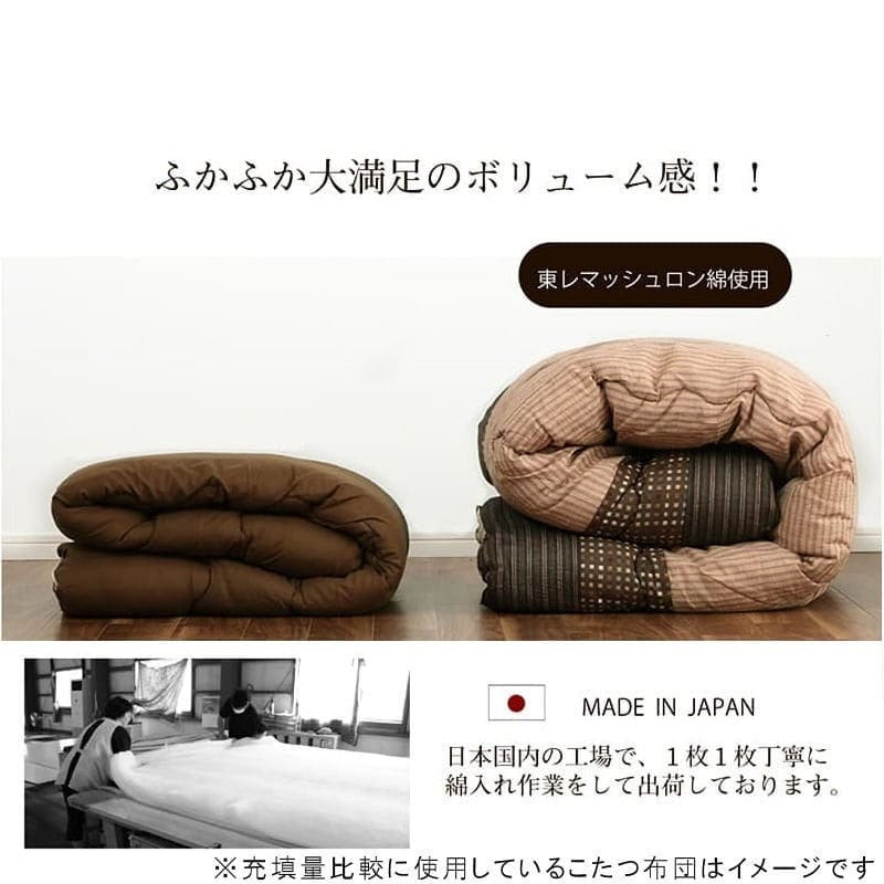 【対応するこたつ天板サイズ】 135~150×90cm 【生地特徴】 表地:ピーチスキン 裏地:フランネル 【洗濯】 手洗い可 【材質】 生地:ポリエステル 充填物:ポリエステル(東レマッシュロン綿) 【充填量】 約3kg(内東レマッシュロン綿:約2.4kg) ※こちらの商品はネイビー系の生地にポイントとしてブラウンカラーが配色されております。
