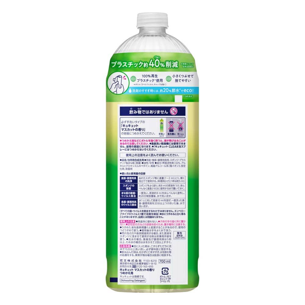 ■キュキュット独自の処方で、ベッタリ油汚れを細かく分解! ■長もち泡が、すすいだ瞬間一気にパッ! 汚れ落ちを指先でキュッと実感 ■スポンジ・まな板の除菌*、まな板・食器・調理用具のウイルス除去※も。 (※全ての菌・ウイルスを除去するわけではありません。エンベロープタイプのウイルス1種で効果を検証) ■手にやさしい ■マスカットの香り ■使いやすさとecoにこだわったつめかえ用ボトル