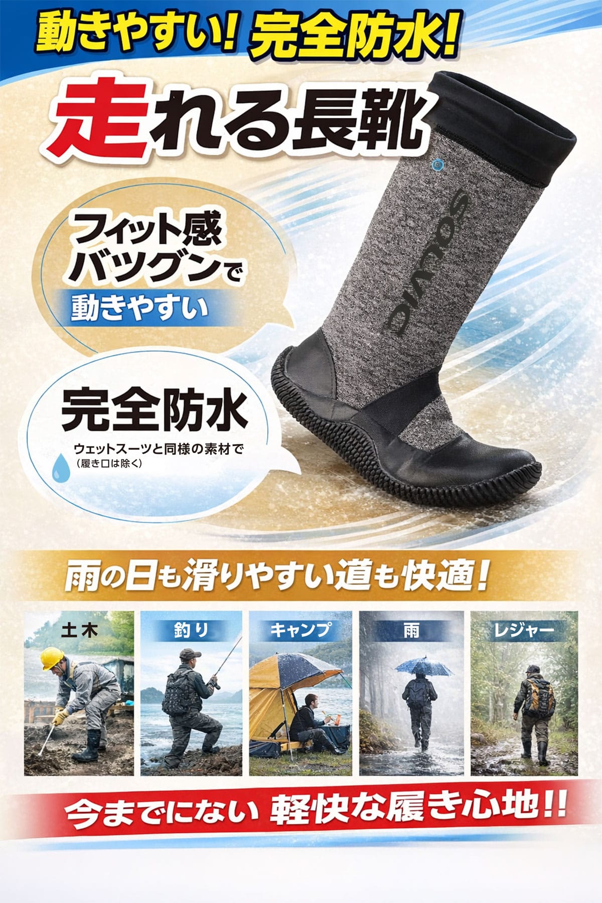 ●ウェットスーツと同様の素材で完全防水※ ※履き口を除く ●柔らかくてフィット感抜群