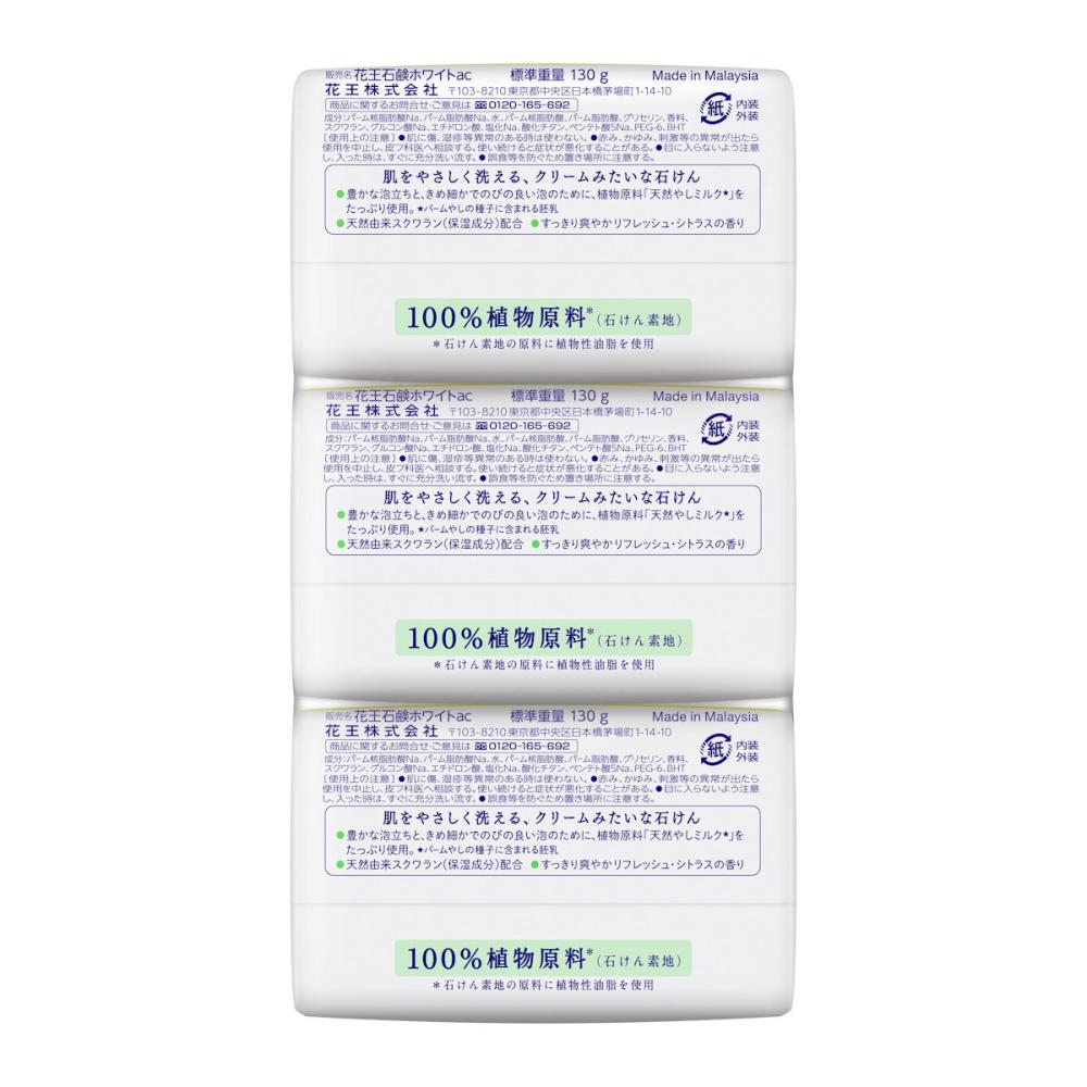 花王の石鹸は、泡にこだわって130年。肌をやさしく洗える、クリームみたいな石けん。 豊かな泡立ちと、きめ細かでのびの良い泡のために、植物原料「天然やしミルク*1」をたっぷり使用。 ●100%植物原料*2(石けん素地) ●天然由来スクワラン(保湿成分)配合 ●すっきり爽やかリフレッシュ・シトラスの香り ●たっぷり洗えるバスサイズ *1パームやしの種子に含まれる胚乳 *2石けん素地の原料に植物性油脂を使用