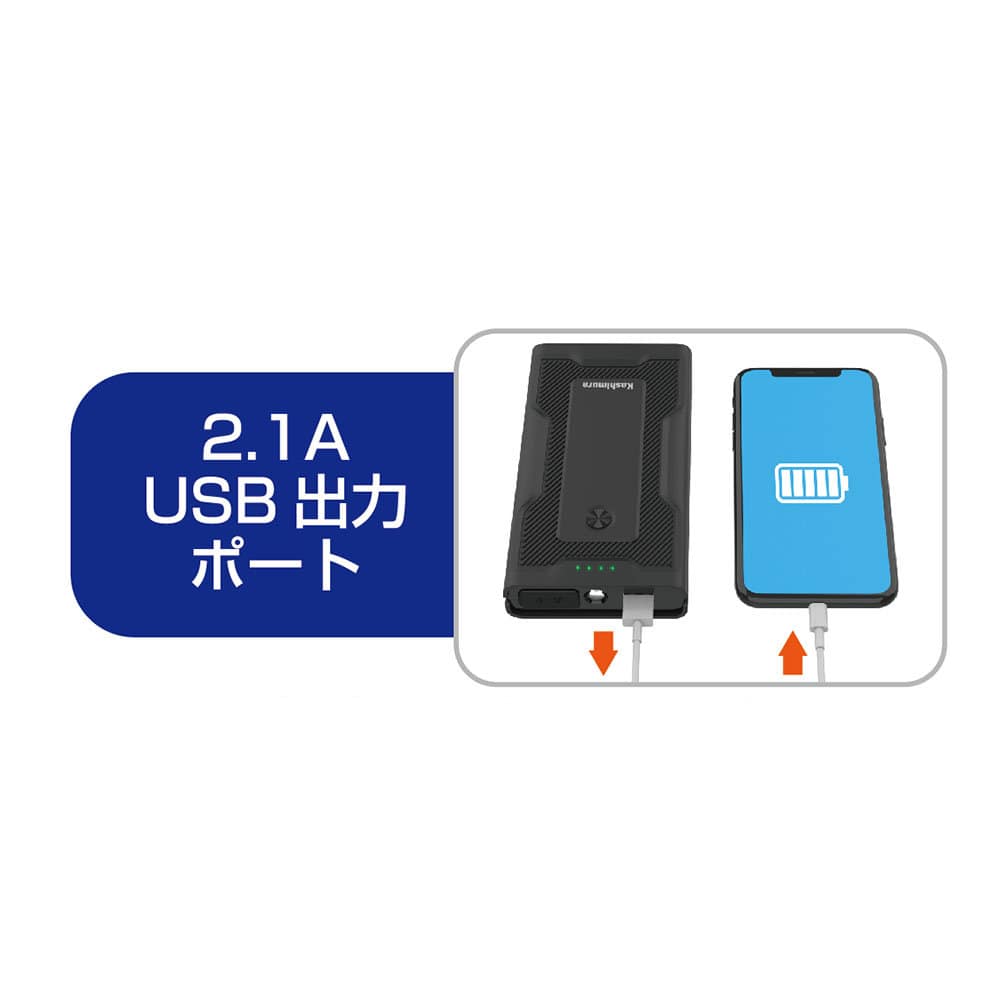 ・モバイルバッテリーとして使用可能な定格2.1A出力のUSBポートを内蔵。スマートフォンやデジタル機器の充電が可能。