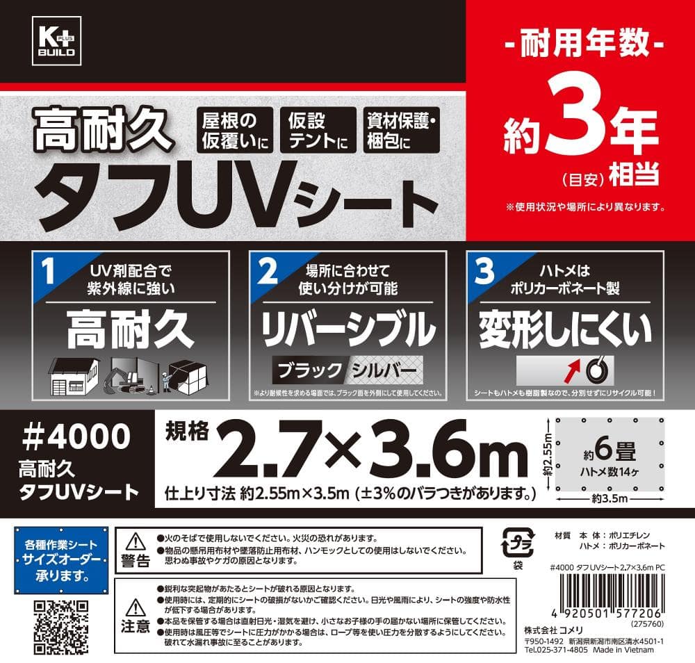 ●高耐久 UV剤配合で 紫外線に強い。 ●リバーシブル(ブラック&シルバー) 場所に合わせて 使い分けが可能※ ※より耐候性を求める場面では、ブラック面を外側に使用してください。 ●変形しにくい ハトメは耐候性、強度のあるポリカーボネート製 シートも樹脂製ないので分別せずにリサイクルできる。 ●耐用年数約3年 (目安)相当 ※使用状況や場所により異なります。