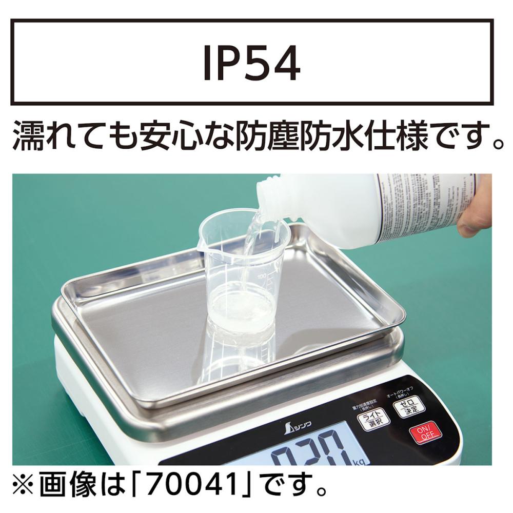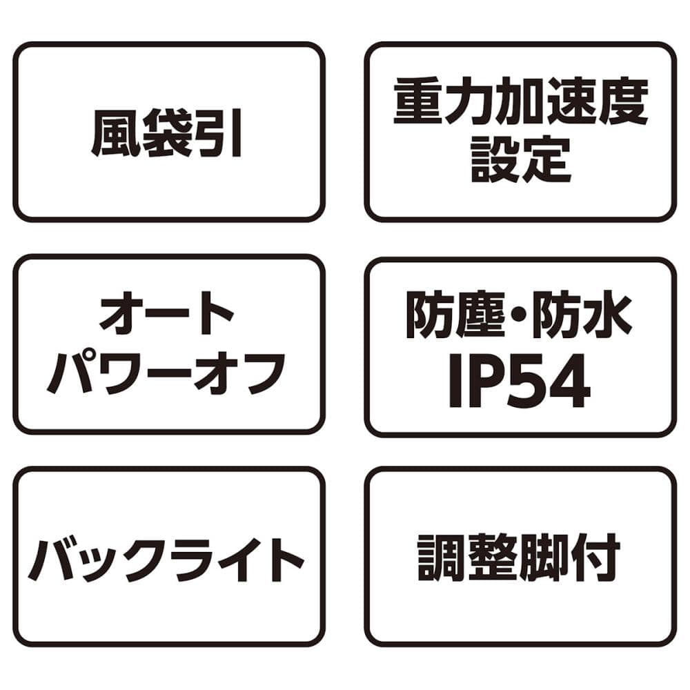 "●風袋引機能付で容器の重さを引いた測定ができます。 ●使用する地域に合わせて重力加速度を設定できます。 ●防塵・防水性能IP54です。 ●オートパワーオフ機能付、バックライト機能付、ステンレス皿付です。"