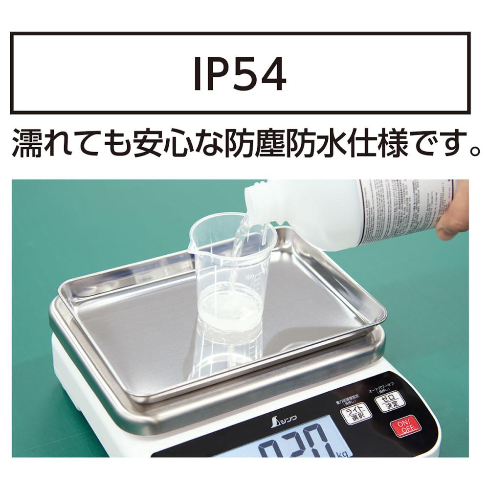 "●風袋引機能付で容器の重さを引いた測定ができます。 ●使用する地域に合わせて重力加速度を設定できます。 ●防塵・防水性能IP54です。 ●オートパワーオフ機能付、バックライト機能付、ステンレス皿付です。"