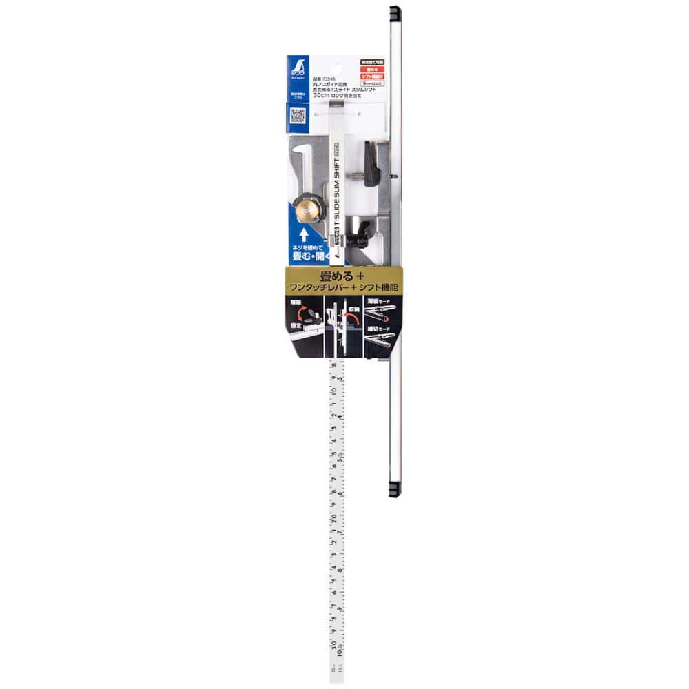 【仕様】 ■目盛全長:cm目盛30cm 尺相当目盛10/33m ■突き当て高さ:15mm(薄板モード)、9mm(細切モード) 【材質】 ■竿、結合部:ステンレス ■突き当て:アルミ、UHPEテープ ■ストッパーネジ:ステンレス、真ちゅう ■保護キャップ:ポリカーボネート樹脂 ■ワンタッチレバー、止ネジ(ブレ防止金具部):ポリアセタール樹脂