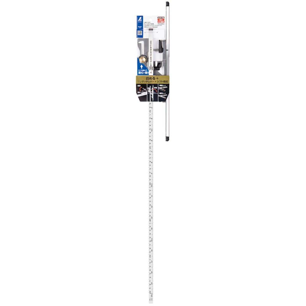 【仕様】 ■目盛全長:cm目盛60cm 尺相当目盛20/33m ■突き当て高さ:15mm(薄板モード)、9mm(細切モード) 【材質】 ■竿、結合部:ステンレス ■突き当て:アルミ、UHPEテープ ■ストッパーネジ:ステンレス、真ちゅう ■保護キャップ:ポリカーボネート樹脂 ■ワンタッチレバー、止ネジ(ブレ防止金具部):ポリアセタール樹脂