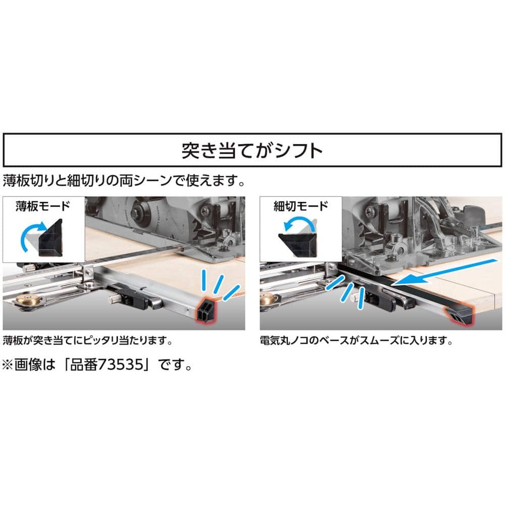 ●ワンタッチレバー搭載で、突き当ての切り替えが素早くできます。また、ネジが脱落しません。 ●薄板と細巾切断の両シーンで使用が可能です。突き当てを起こすことで薄板が入り込まずに切断できます。また、突き当てを倒すことで細巾切断が可能になります。 ●9mmボードを重ねた状態で切断するのに最適な突き当ての高さで、2枚目の材料に干渉しません。 ●U字曲げ加工を実現したステンレス竿で、サビにくく高強度(従来品の1.5倍)に仕上げました。