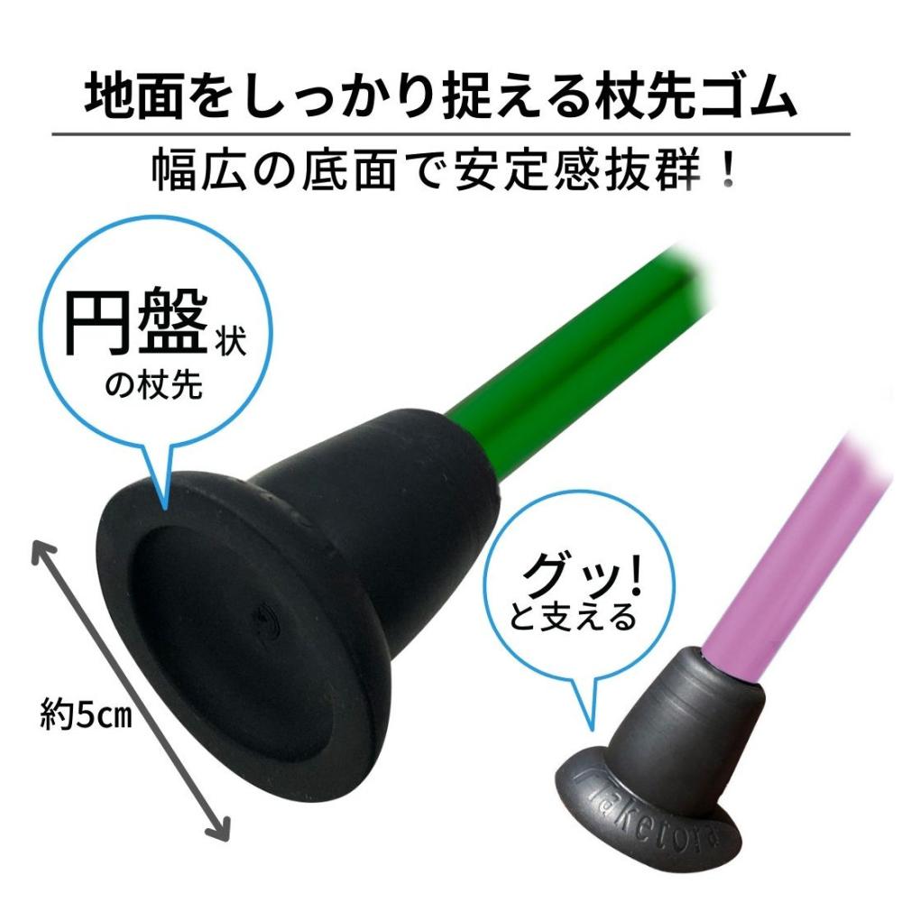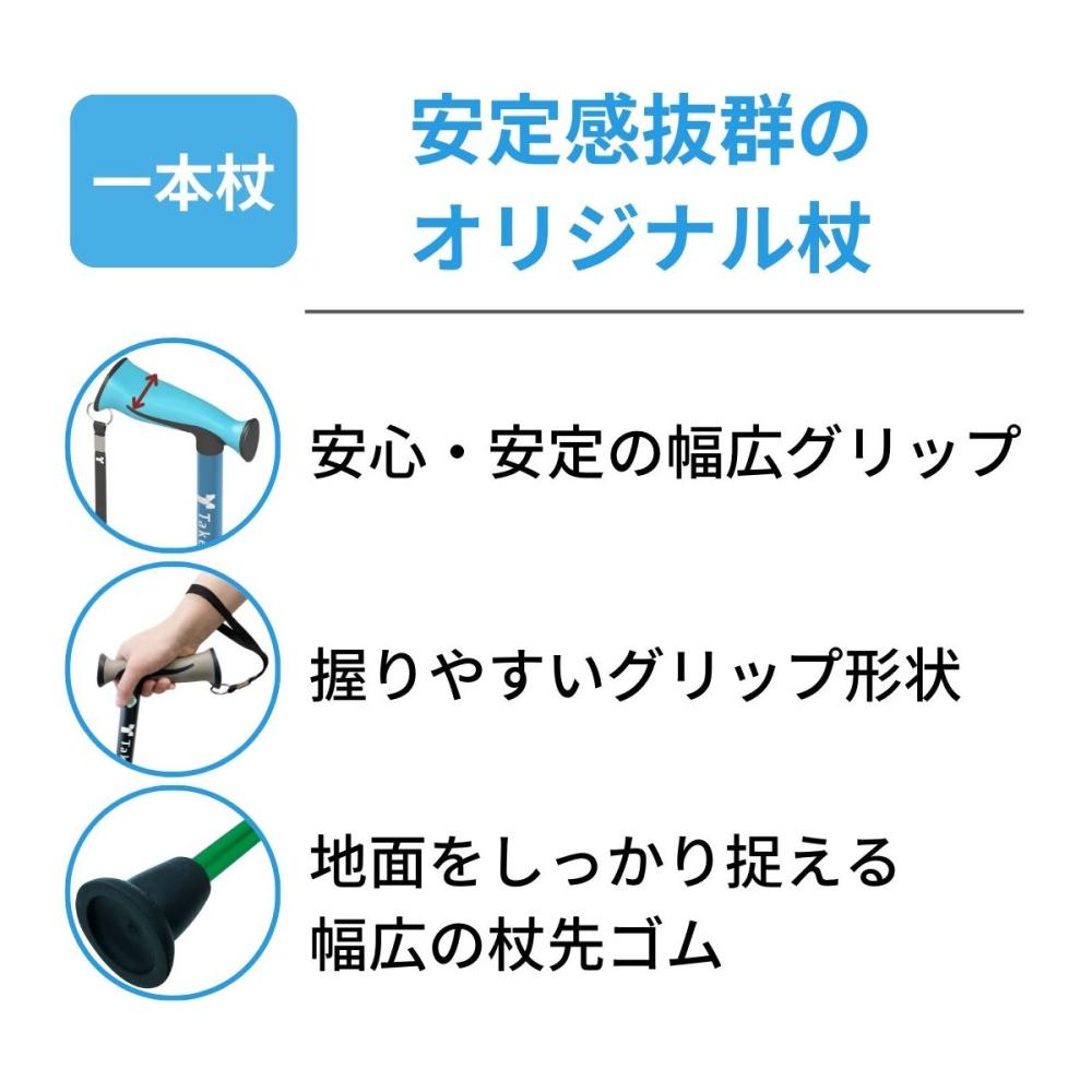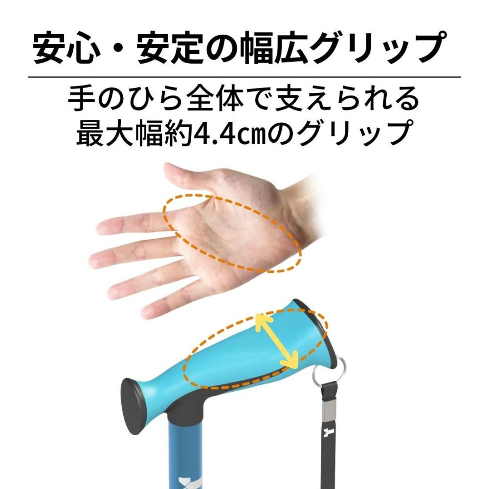 特徴 ・手のひらや手首への負担が少ないワイドグリップ。 ・幅広のグリップで手への負担をサポート。 ・接地面が広く食いつきの良い杖先ゴムで安定感を確保。 ・杖から手をはなしても安心なストラップ付き。 仕様 ●サイズ/長さ68から96cm(12段階/2.5cm) ●パイプ径/上部:2.2cm、下部:1.9cm ●重さ/390g ●材質/本体:アルミ、グリップ:TPR・PP、ストラップ:ポリエステル、杖先:TPR ●生産国/台湾