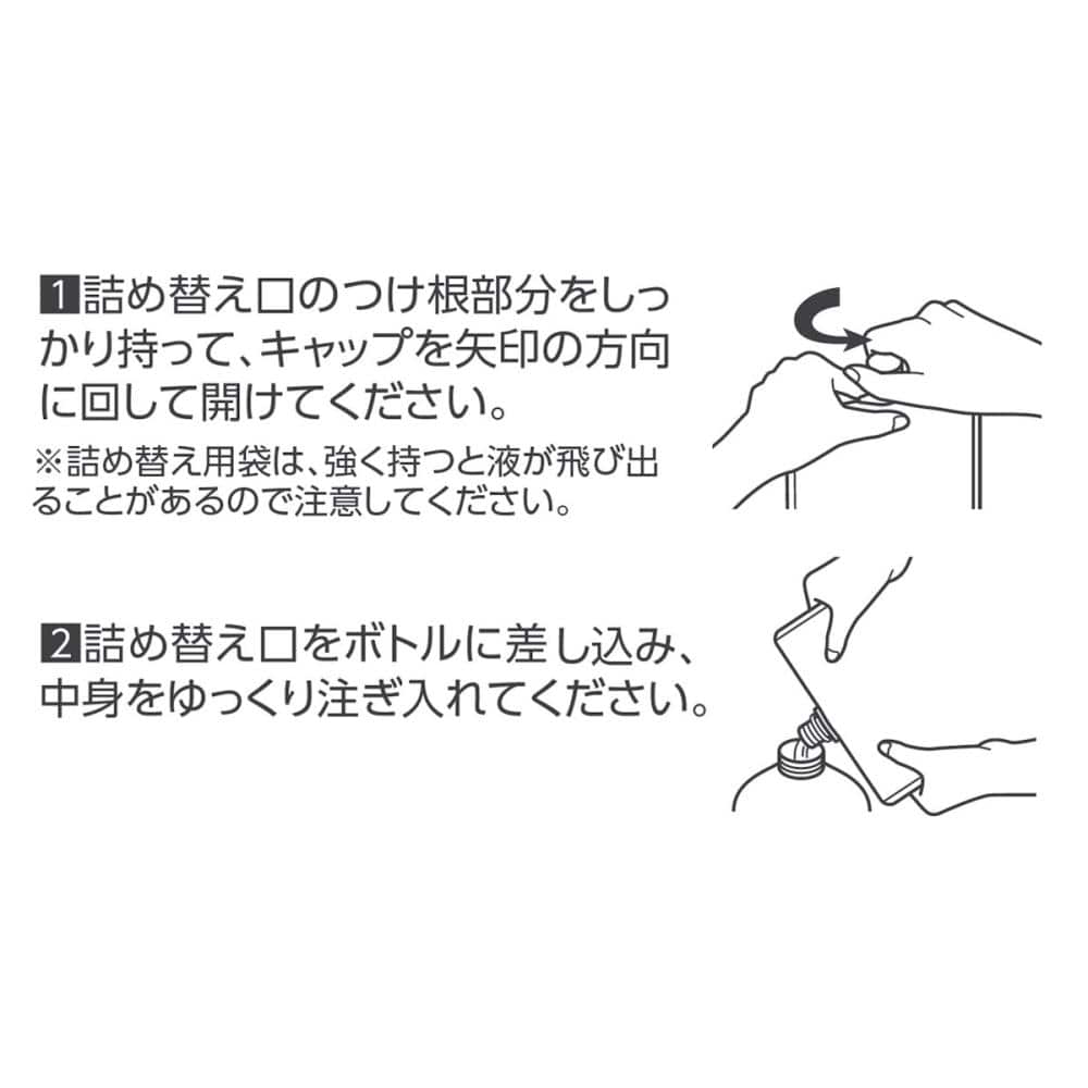 ※詰め替え用袋は、強く持つと液が飛び出ることがあるので注意してください。