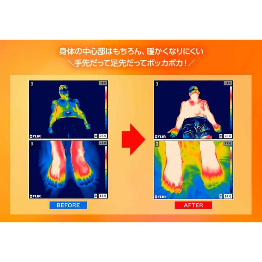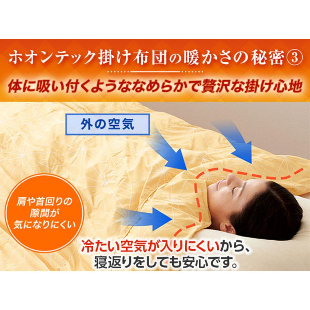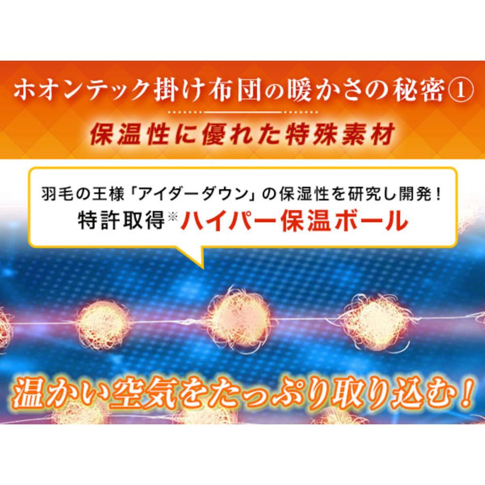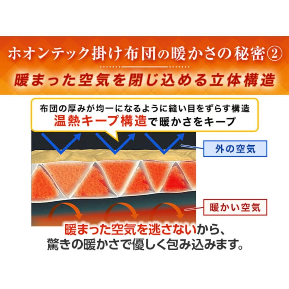 ・上層綿(ハイパー保温ボール)と下層綿(吸湿発熱ボール)を縫い目をずらし立体に重ねる独自構造によって、暖かい空気をキープ。