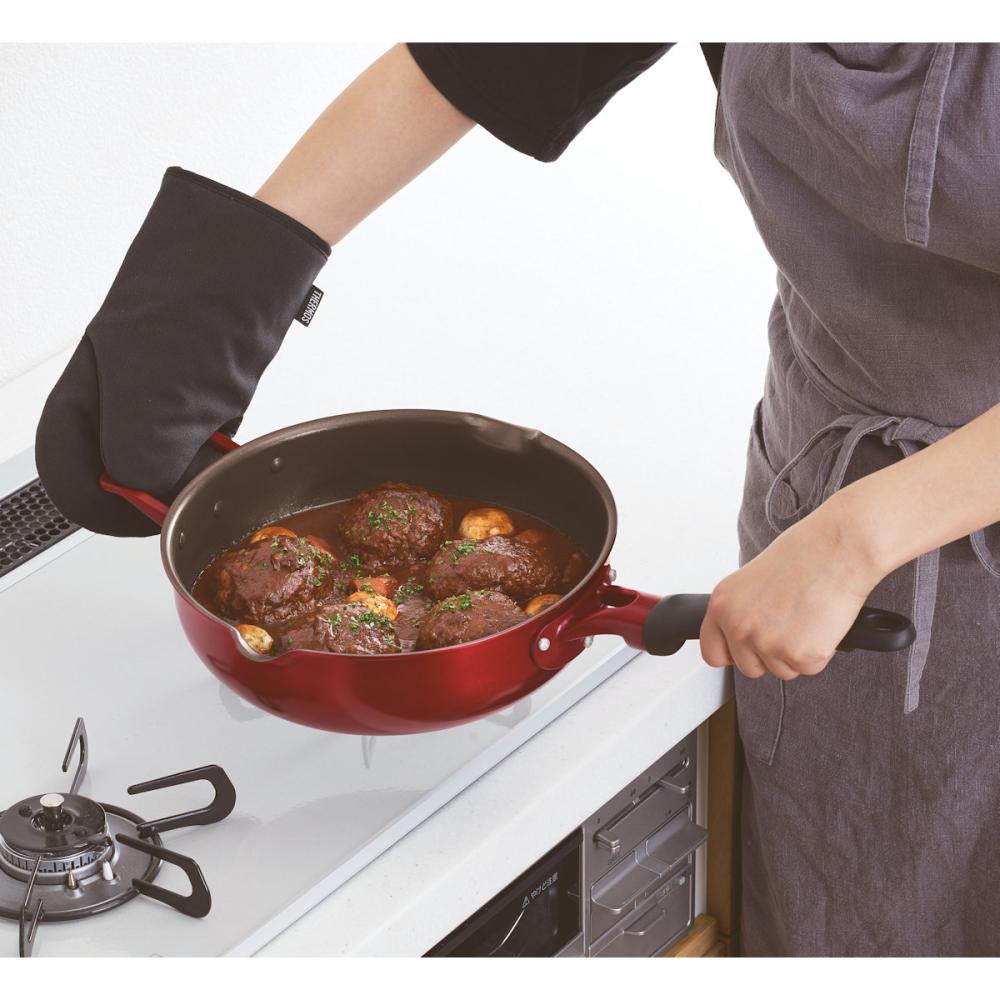 ■【本体重量】1000g ■【表面加工】内面:ふっ素樹脂塗膜加工 / 外面:(底面を除く)焼付け塗装 ■【材料の種類】本体:アルミニウム合金 / はり底:ステンレス鋼(クロム13%)(底の厚さ:3.3mm(はり底を含む)) / 取っ手:フェノール樹脂 / 補助取っ手:アルミニウム合金(セラミック塗膜加工)