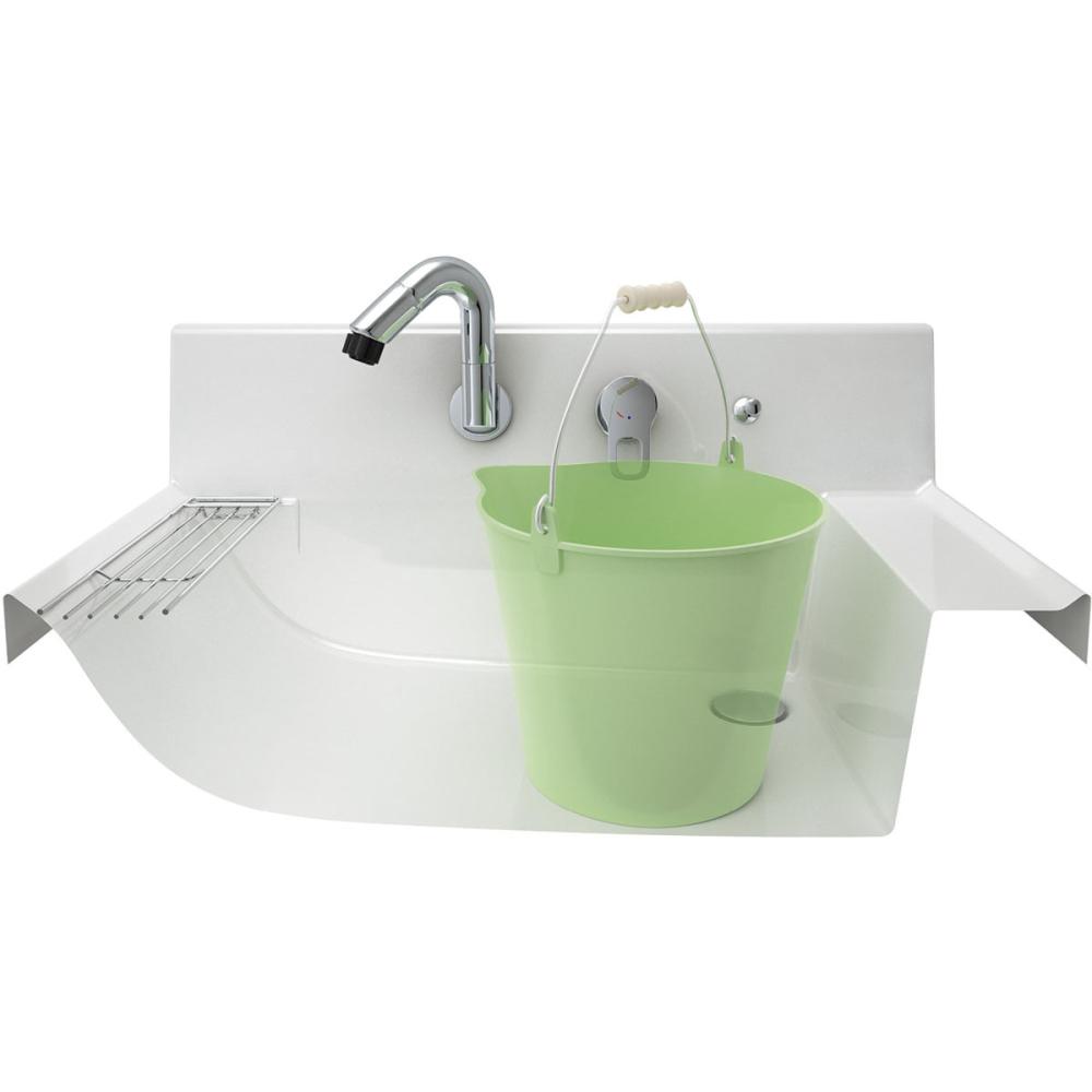 ●水栓:ホース引出式壁付け洗髪シャワー水栓(左右に180度回転。使いたい位置にくるりと回せるくるくる水栓)