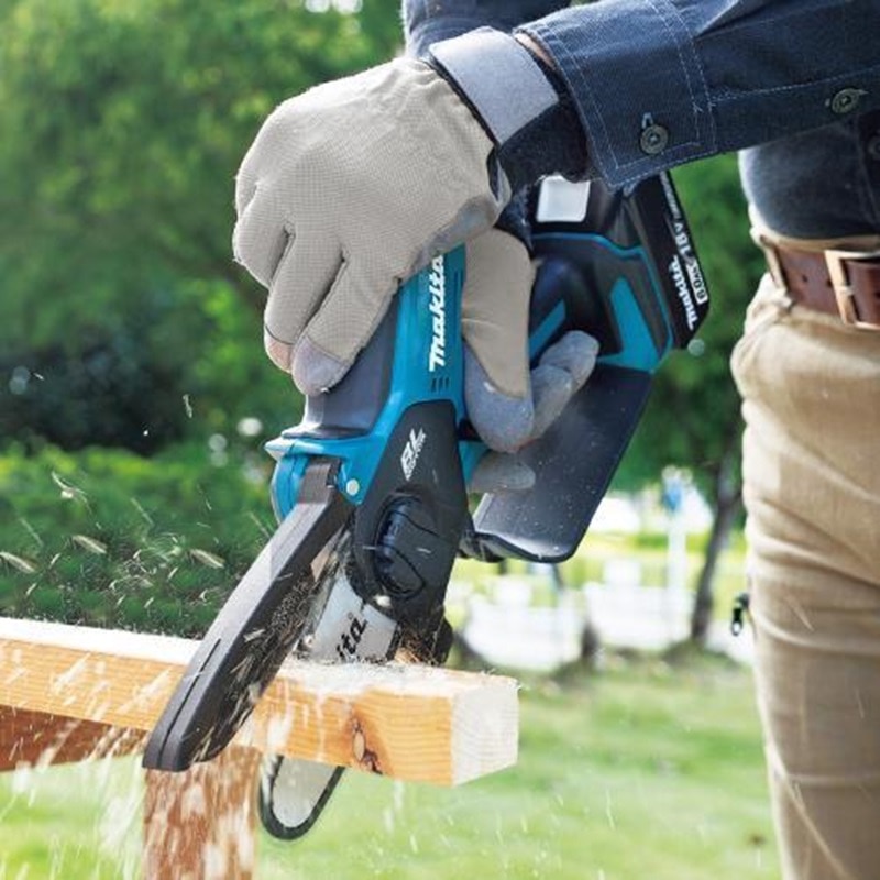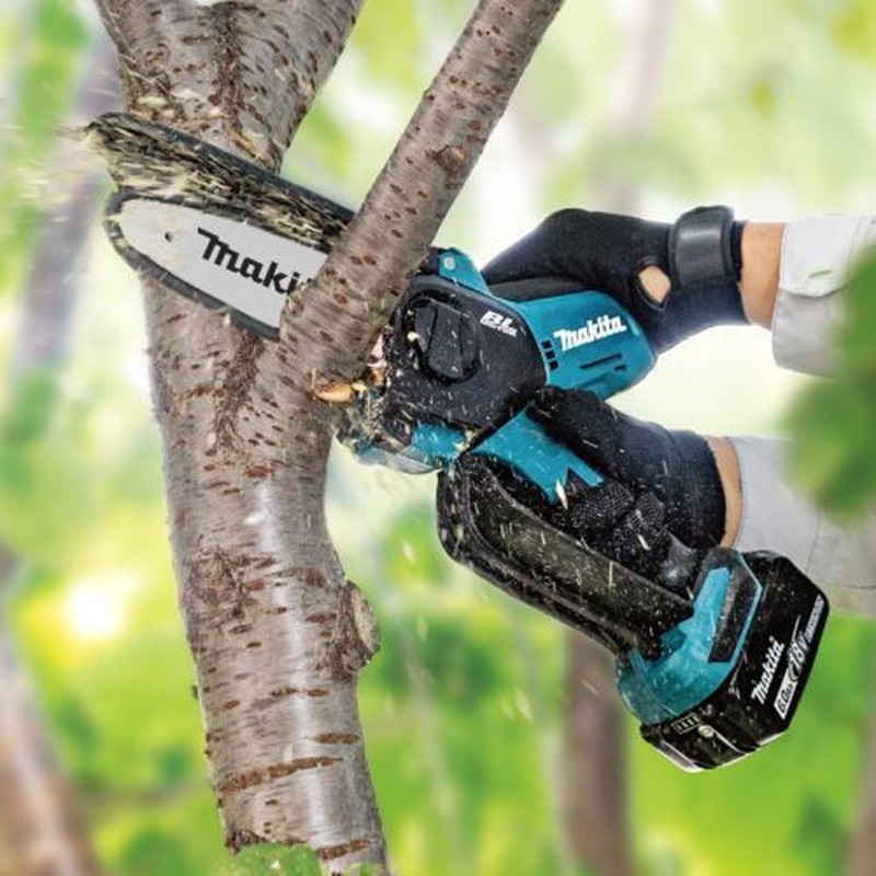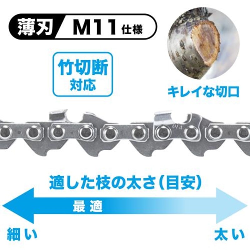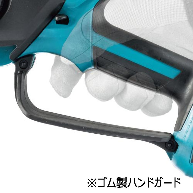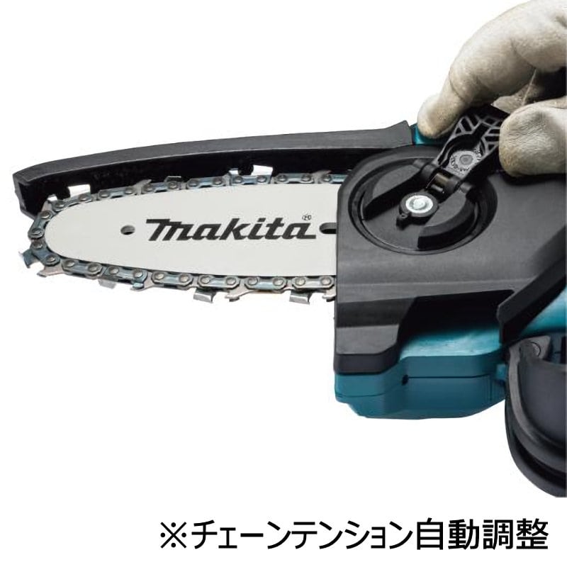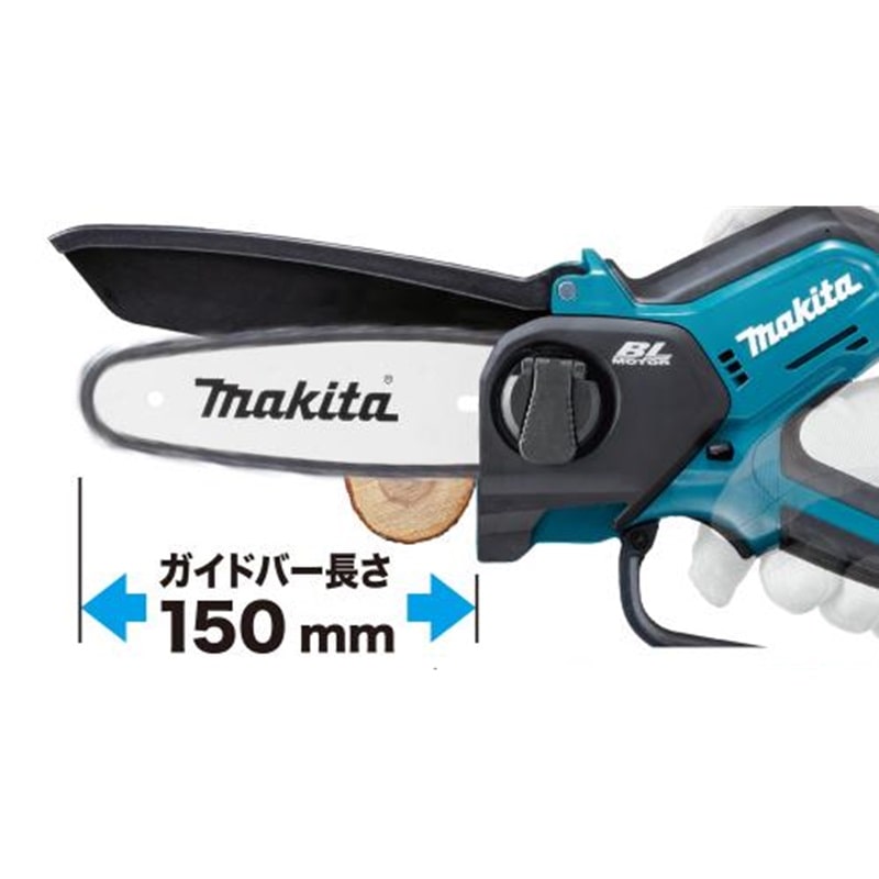 ●18Vバッテリ。チェーンオイル自動給油 ●チェーンテンション自動調整 ●ガイドバー長さ:150mm ●チェーンスピード:8m/秒 ●チェーン形式:80TXL-32E ●充電時間:約40分 ●1充電当たりの作業量(ひば材50mm)●切断:約440本(バッテリBL1860B使用時) ●標準付属品:本体・バッテリBL1860B1コ・充電器DC18RF・チェーンオイル・チェーンカバー