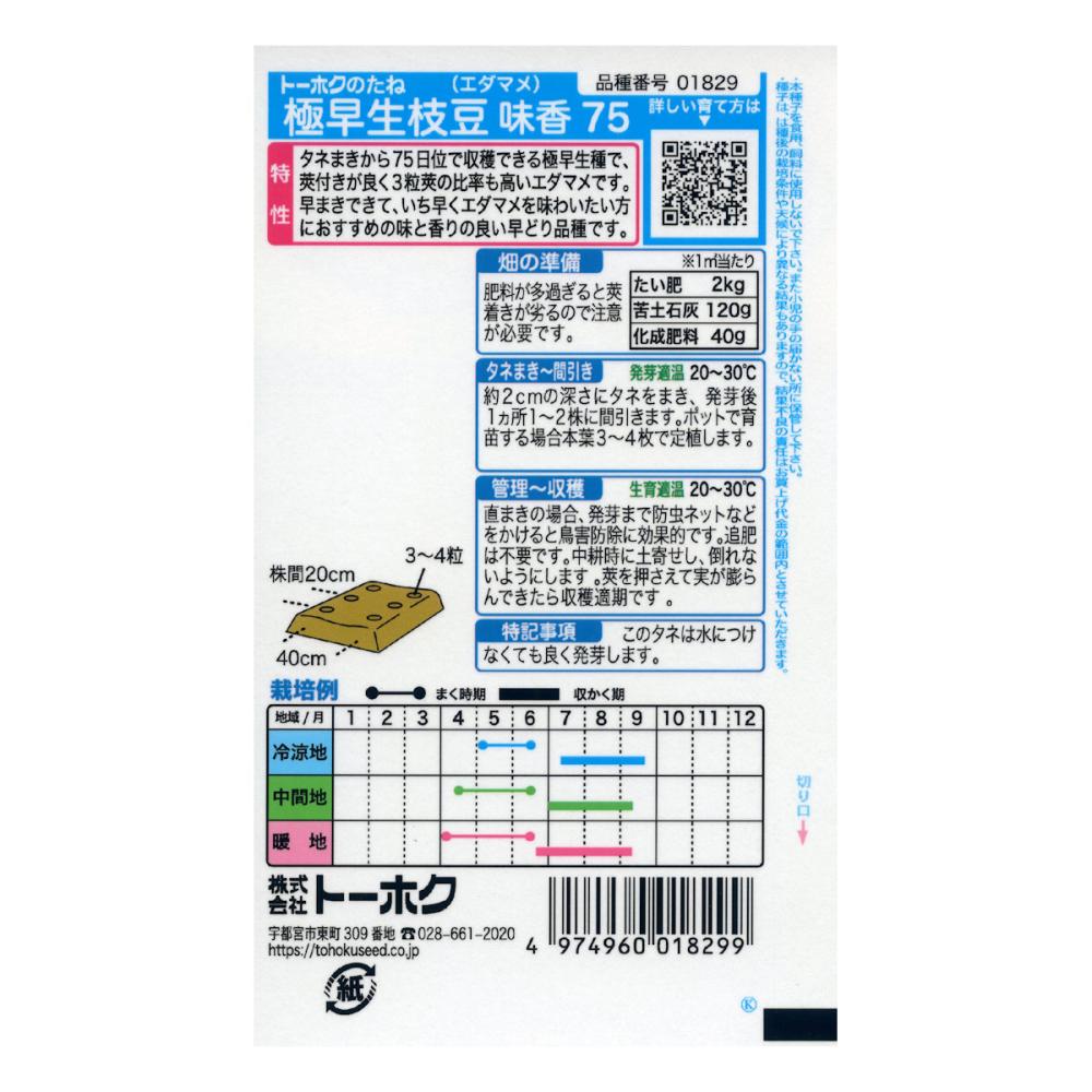 タネまきから75日位で収穫できる極早生品種。早まきできて、いち早くエダマメを味わいたい方におすすめ。3粒莢も多い奥原系で、味と香りの良い早どりエダマメです。スーパーでは買えない風味が家庭菜園では楽しめます。