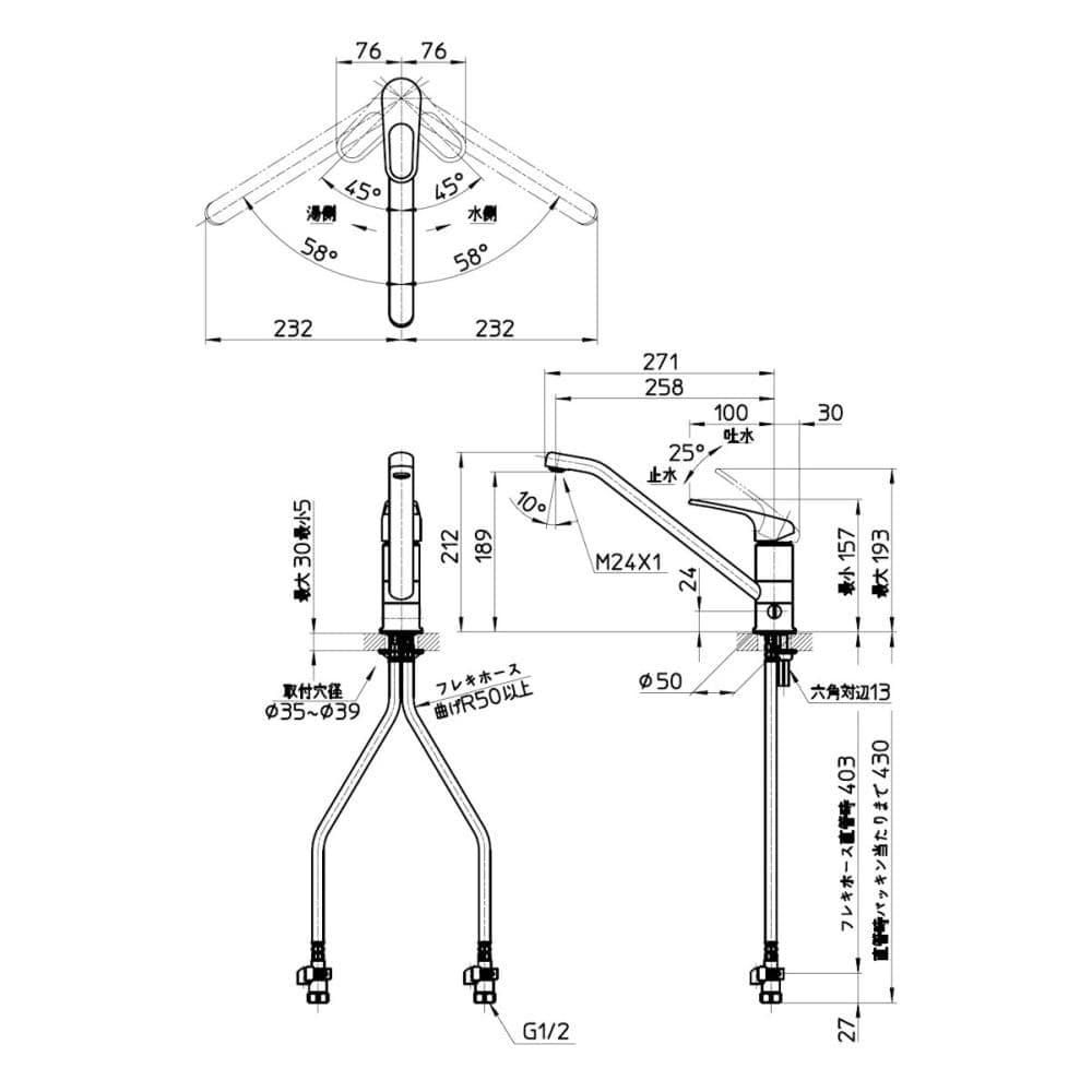 ●水栓の取付面とカウンター天面との段差が9mm以上ある場合は取付できません