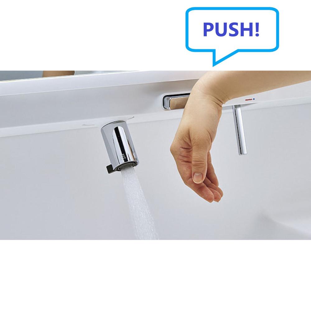 汚れがたまりにくい 「壁付水栓」。お掃除がしやすく、デザイン性が高い ワンランク上の洗面化粧台です。 |
