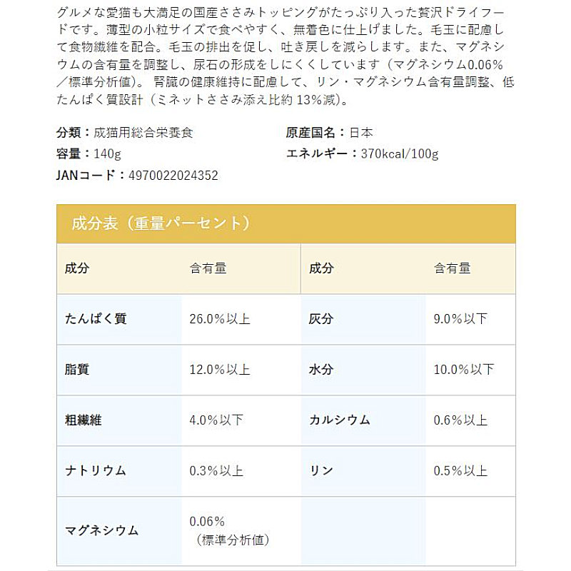 原材料・成分:肉類(ミートミール、ささみ、チキンミール、ポークミール、チキンレバーパウダー)、とうもろこし、でん粉類、動物性油脂、魚介類(フィッシュミール、フィッシュエキス、フィッシュパウダー)、セルロース粉末、ビール酵母、酵母細胞壁、植物発酵抽出エキス、殺菌乳酸菌、ビタミン類(A、D、E、K、B1、B2、B6、葉酸、コリン)、アミノ酸類(メチオニン、タウリン、トリプトファン)、pH調整剤、ミネラル類(カリウム、鉄、亜鉛、銅、ヨウ素)