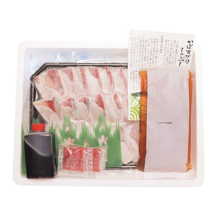 大分県のブランド魚かぼすブリをしゃぶしゃぶ用に薄引きにしてオリジナルの魚介だしたっぷりの和風スープをベースにした鍋セットに仕上げました。