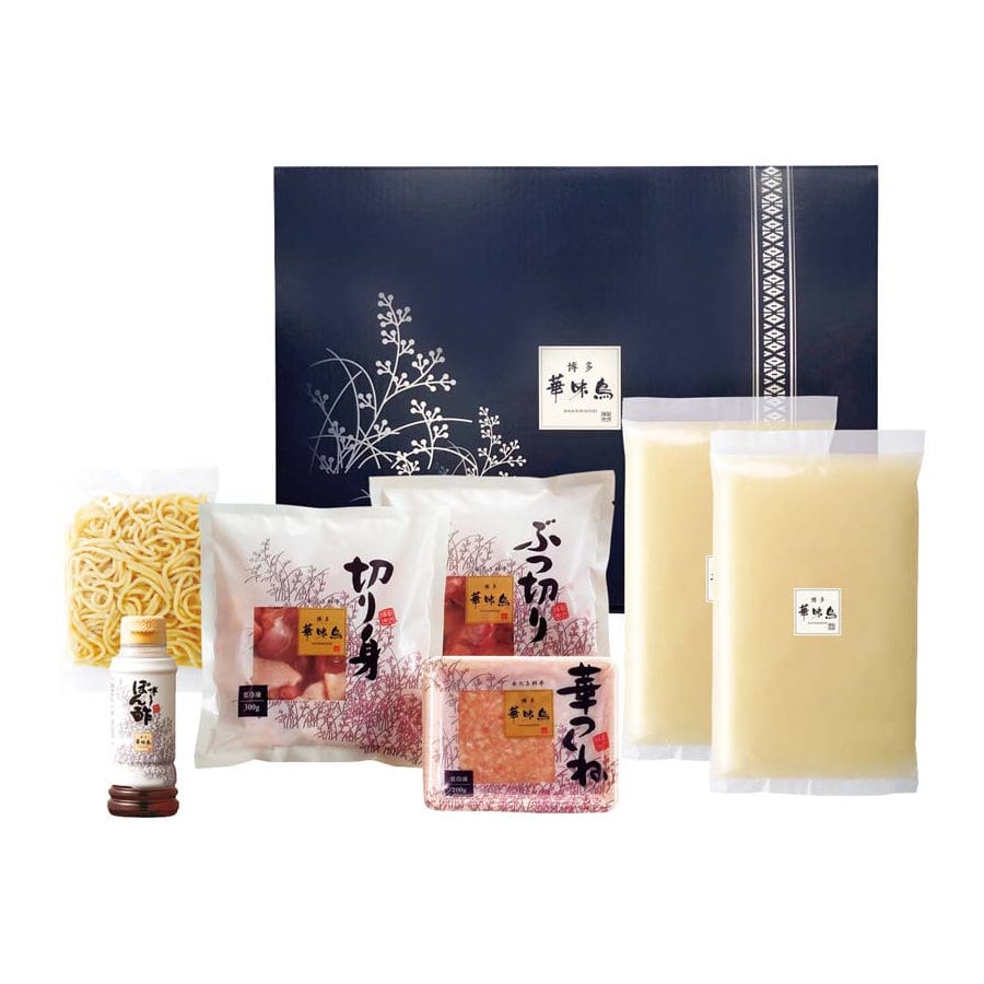 【セット内容】水たき生スープ600g×2、華味鳥(切り身、ぶつ切り)各300g、華つくね200g、博多ぽん酢220ml、ちゃんぽん麺150g
