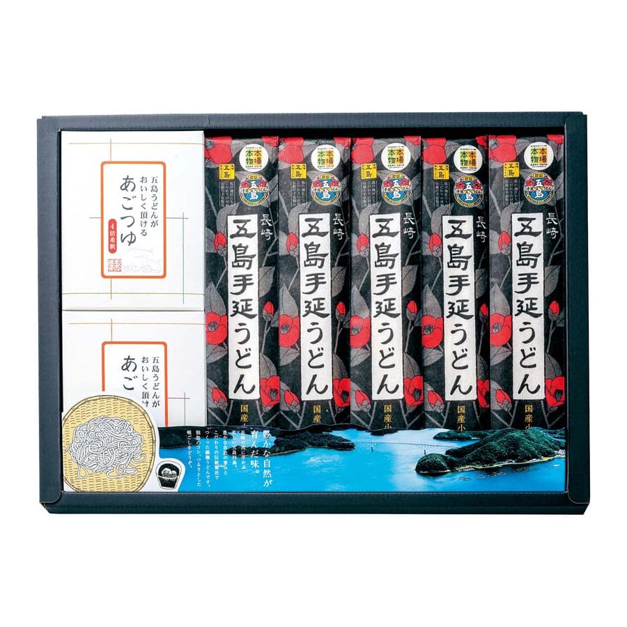 うどん:「本場の本物」認定商品、国産小麦、五島灘の海水でつくられた食塩、椿油を100%使用して作られています。 あごつゆ(希釈用):長崎産飛魚に鰹と昆布を合わせた風味豊かな濃縮4倍のだしつゆです。