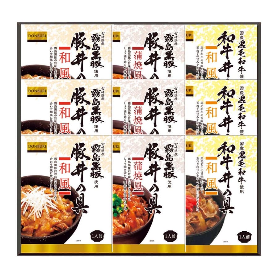 【セット内容】霧島黒豚豚丼の具(和風、蒲焼風)各100g×各3、黒毛和牛丼の具(和風)100g×3
