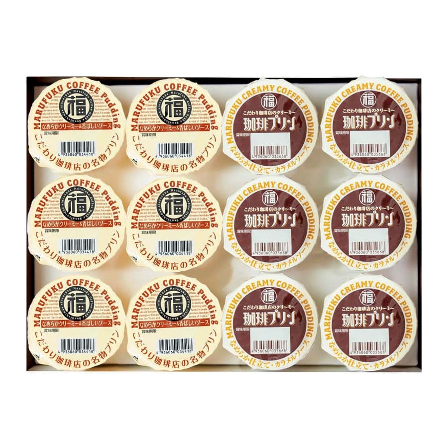 クリーミーで濃厚なカスタードプリンの名物プリンに、丸福珈琲店のオリジナルコーヒーを使用した珈琲プリンのセットです。