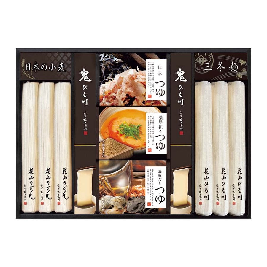 【セット内容】花山うどん90g×3、花山ひも川90g×3、鬼ひも川90g×2、伝承つゆ70g×3、海鮮だし60g×3、担々つゆ60g×2