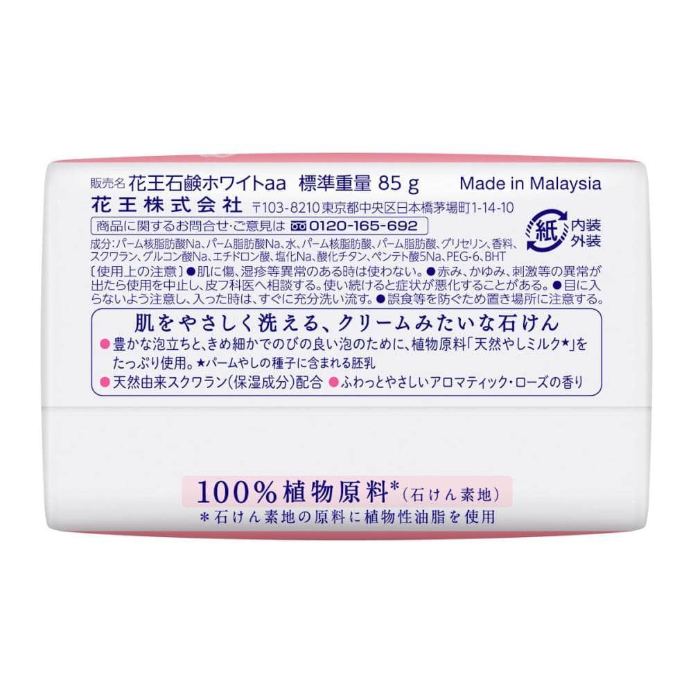 花王の石鹸は、泡にこだわって130年。 肌をやさしく洗える、クリームみたいな石けん。 豊かな泡立ちと、きめ細かでのびの良い泡のために、植物原料「天然やしミルク*1」をたっぷり使用。 ●100%植物原料*2(石けん素地) ●天然由来スクワラン(保湿成分)配合 ●アロマティック・ローズの香り ●たっぷり洗えるバスサイズ *1パームやしの種子に含まれる胚乳 *2石けん素地の原料に植物性油脂を使用