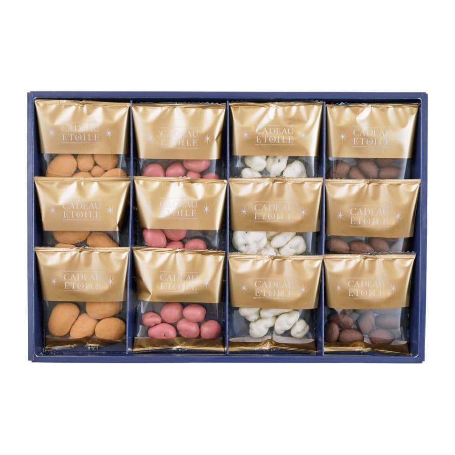 【セット内容】クルミ×ホワイトチョコレート、アーモンド×ミルクチョコココア、クランベリー×イチゴチョコレート、ピーカンナッツ×キャラメルチョコレートを各3袋、合計12袋