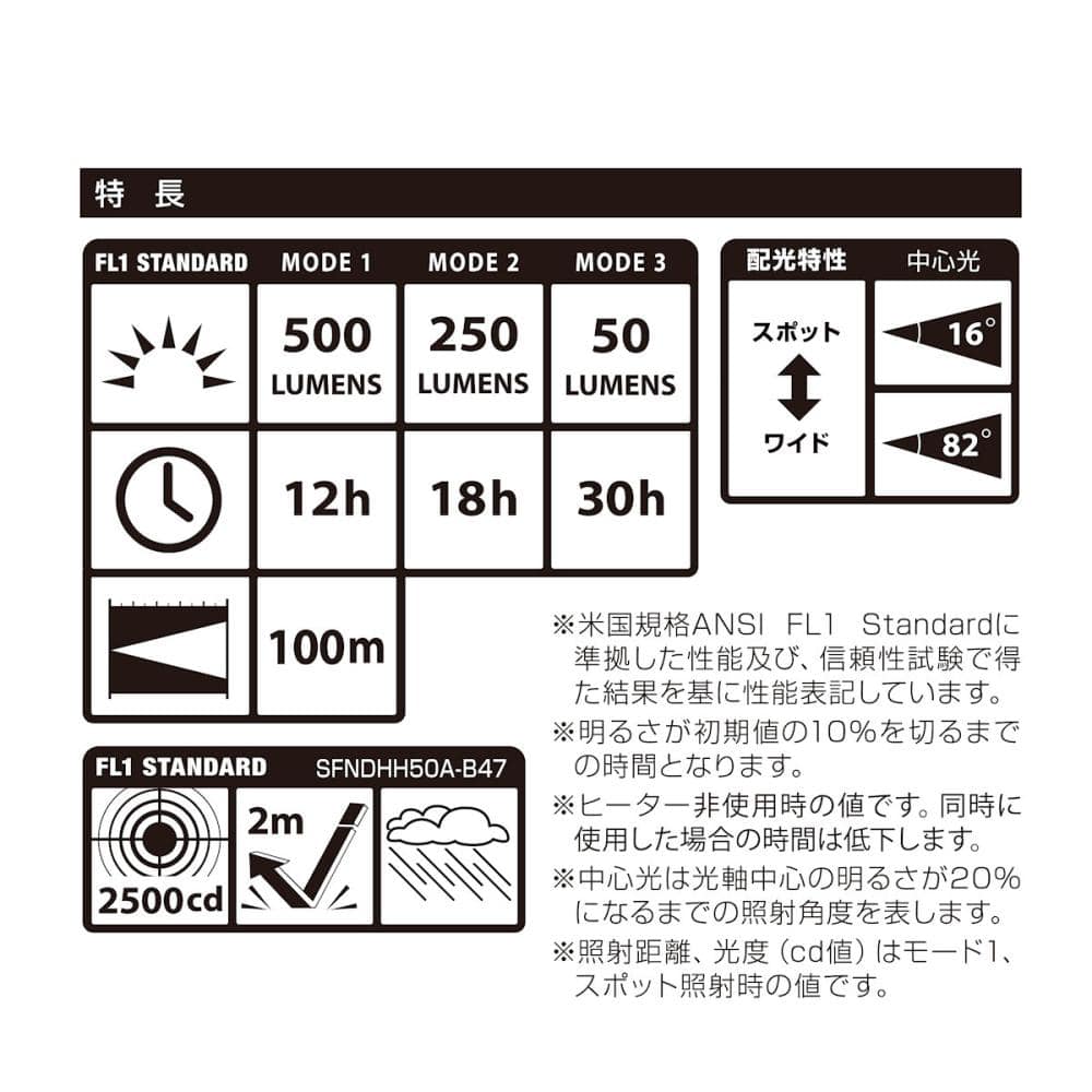 ●セフ+LEDハンドライト+ハンドヒーター ●セフホルダーにサッと着脱できる ●テールキャップに収まる可動式セフフック構造 ●スイッチONでグリップ全周がすぐ温まる急速発熱設計 ●スライドフォーカス機能搭載。スライド式でスポット??ワイド照射を切替できる ●ハイ / ミドル / ローの明るさ3モード切替 ●バッテリーインジケーター搭載。ボタン操作で確認可能 ●移動時や接触でONにならない誤作動防止形状プッシュスイッチ ●減電警告付 ●アルミボディ。落下防止器具取付穴付 ※セフホルダーは別売となります ●明るさ:最大500lm ●使用電池:専用充電池(LE-ZP3747) ●照射距離:100m(モード3) ●配光特性:スライドフォーカス ●防水仕様:IPX4 ●落下強度:2m 【付属品】 ●リチウムイオン充電池3747 ●USB充電ケーブルPU3