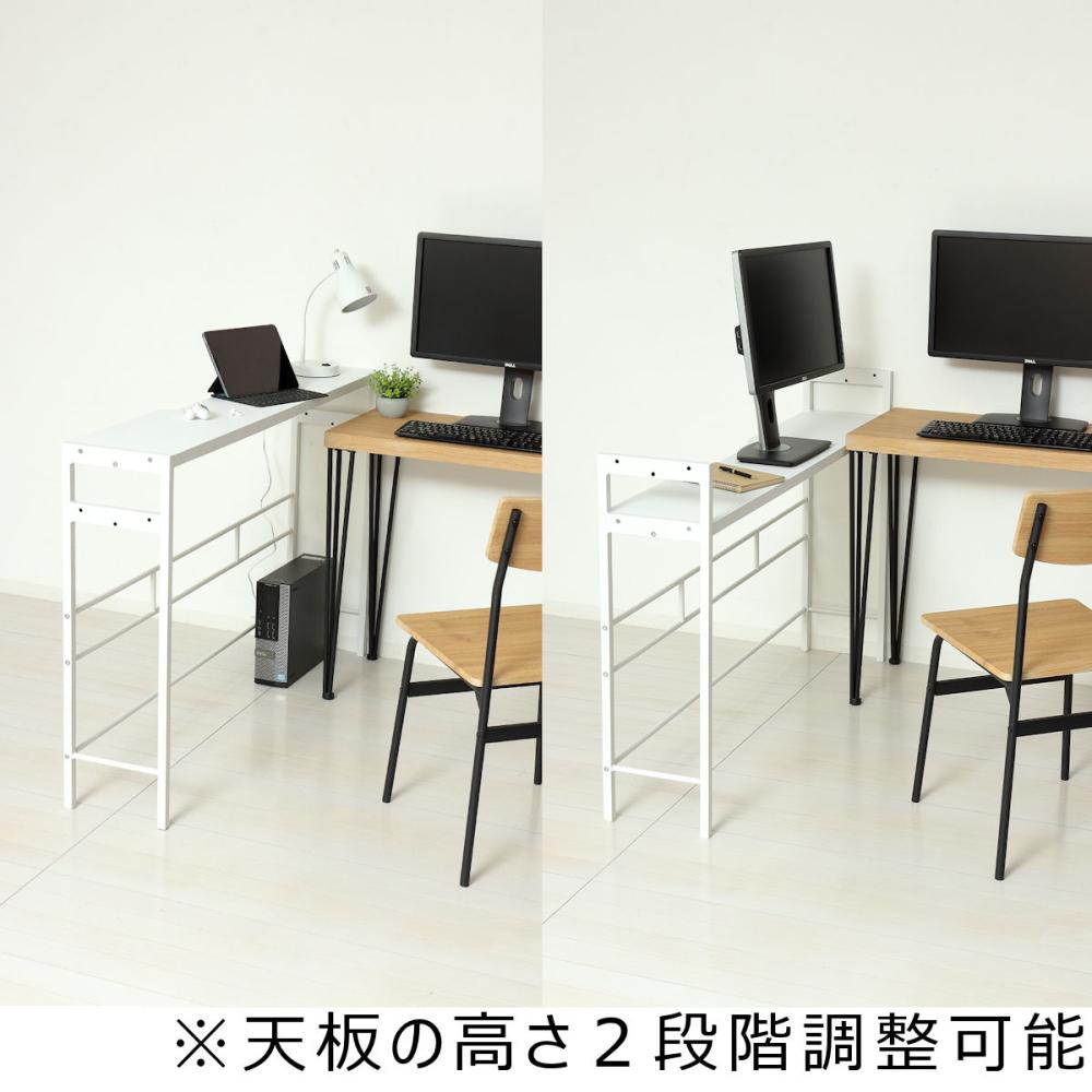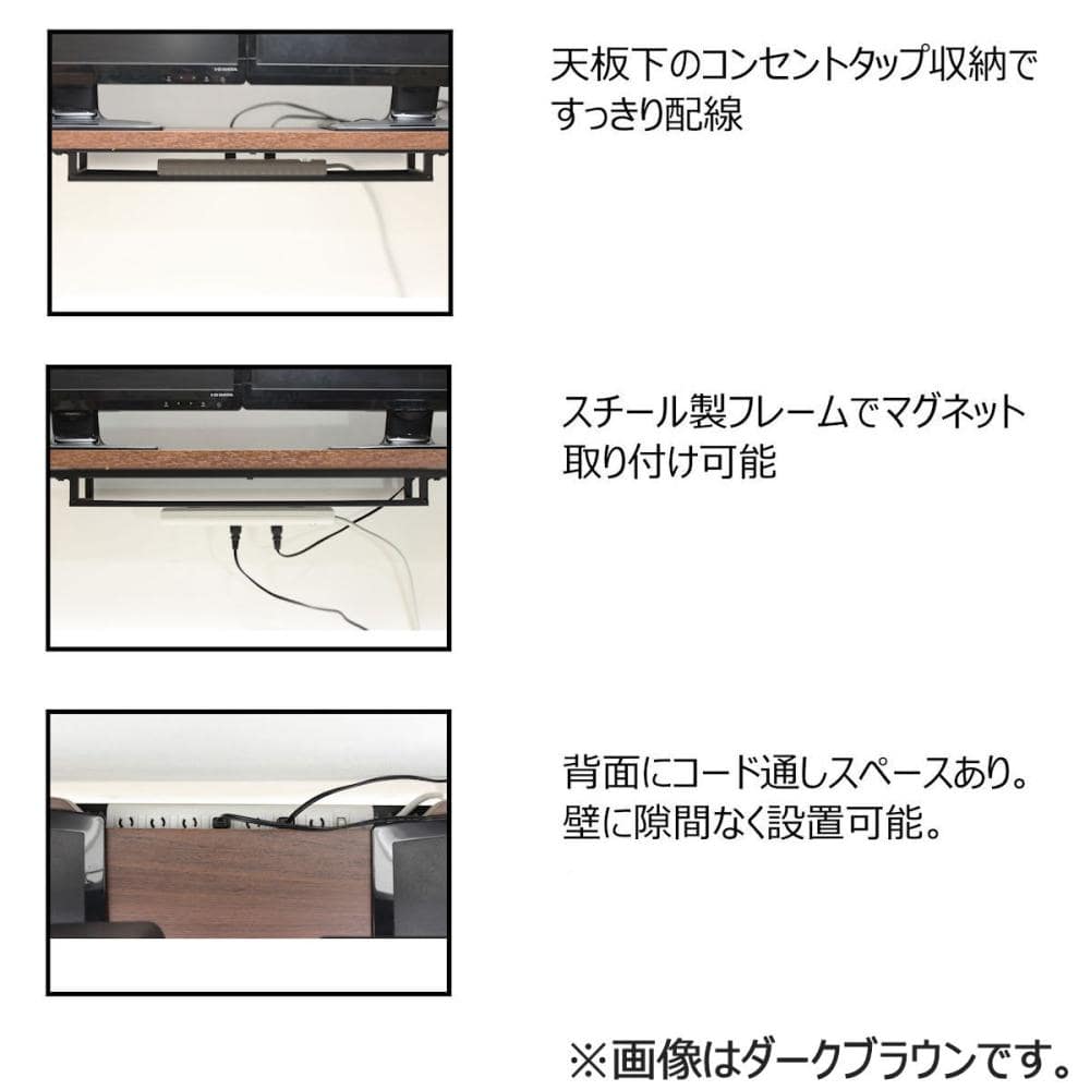 ■モニターが2台置けるので家で仕事をする方やゲームをする方にもおすすめです。 ■天板下にコンセントタップ収納があり、すっきりと配線ができます。背面にはコード通しのスペースがあるので、コードを使用しても壁面に隙間なく設置が可能。 ■天板を2段階に高さ調節が可能です。 ■アジャスター付きなので多少のガタ付きも微調整できます。