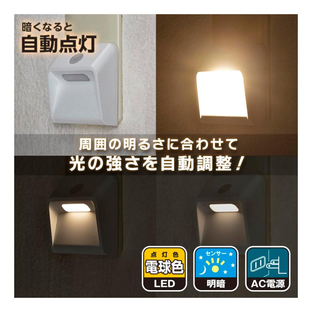 ・周囲の明るさに合わせて光の強さを自動調整します ・耐トラッキングPSE新基準(平成27年1月16日改正)準拠 ・LEDを使用しているので長寿命、省電力です ・点灯色:電球色 ・壁面照射タイプ ・電源:AC100V 50/60Hz ・消費電力:約0.4W ・使用光源:LED3灯(交換不可)/電球色 ・全光束:約30lm(最大)