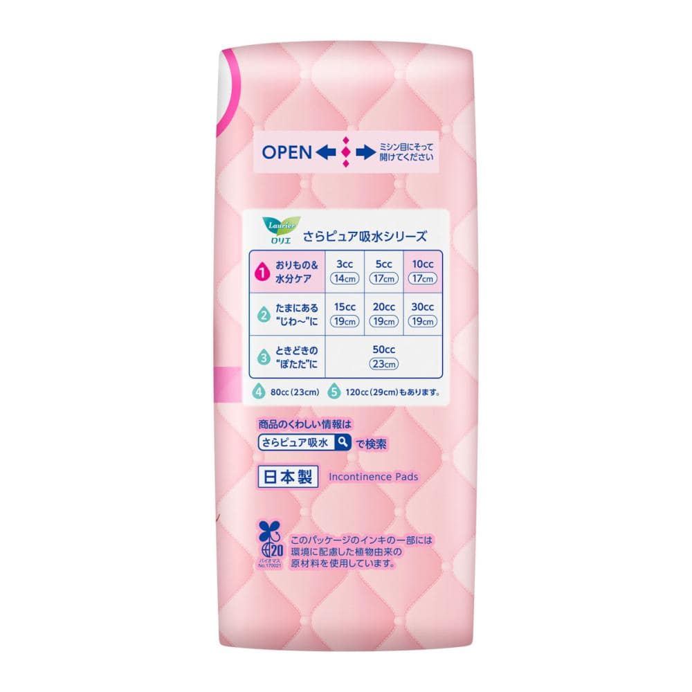 もしもの時も安心な女性のおまもり「さらピュア吸水」から頼れる超吸収スリム。 安心も快適もよくばった「きちんと設計」だから、薄さ2.7mmなのに「パワフル吸水」。 あっ!と思った瞬間にすぐにさらさら。 さらに「瞬間消臭」でニオイもすばやく閉じ込めます。 軽やかで肌にもやさしい。ムレにくく、ズレにくい。前側少し幅広形状。 くしゃみなどでの「ちょこっと」もれが心配な方に。 吸収量10cc、長さ17cm、無香料。