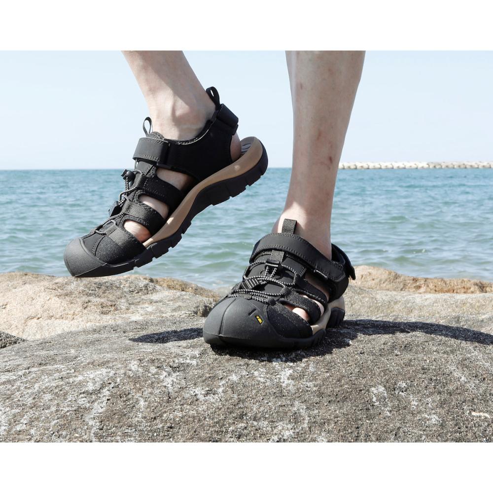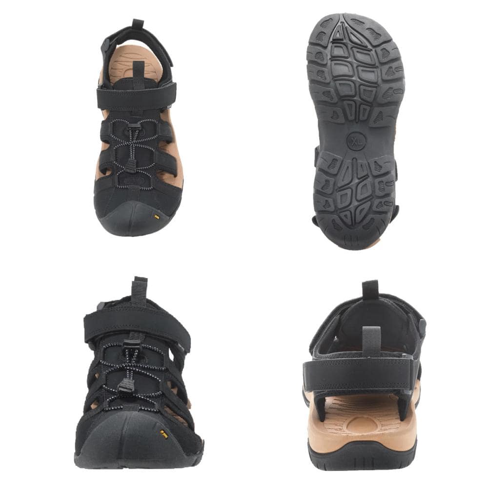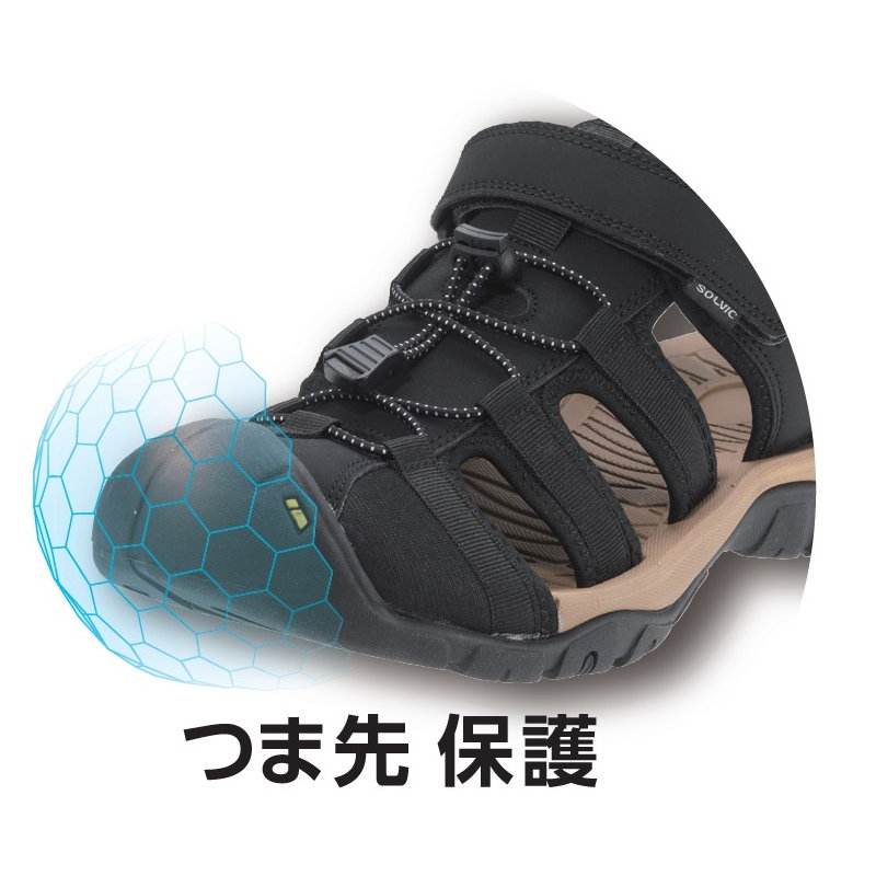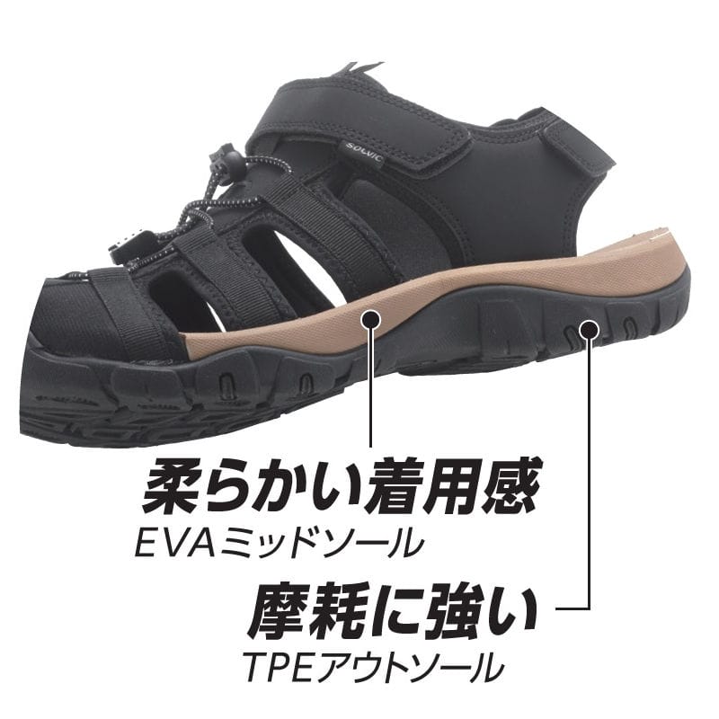 ●柔らかい着用感 EVAミッドソールを採用し、柔らかく快適な履き心地を実現しています。 ●保護されたつま先 つま先を保護する構造になっており、岩場などでの怪我を防ぎます。 ●摩耗に強い TPEアウトソールを採用し、摩耗に強く長持ちします。 ●軽量 EVAミッドソールとTPEアウトソールを使用することで、軽量なサンダルになっています。 ●2本ベルトと 調整ひもで ガッチリ固定 足の甲とかかとにあるマジックテープ付きベルト、足の甲にある調整ひもの3点でガッチリフィット。 激しいうごきにも対応できます。