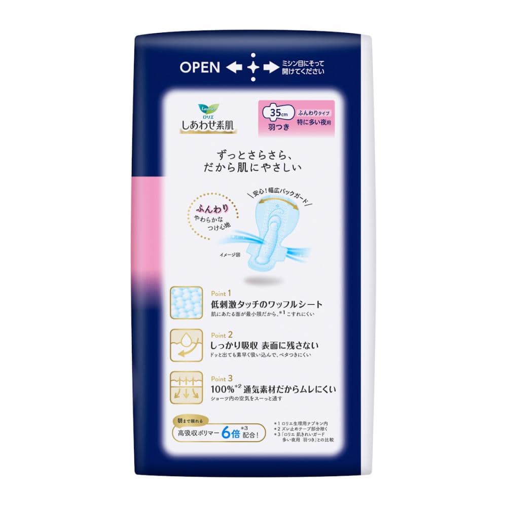 ●高吸収ポリマー約6倍配合(「ロリエ肌きれいガード多い夜用羽つき」との比較)(医薬部外品)