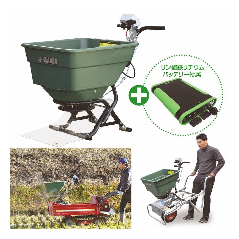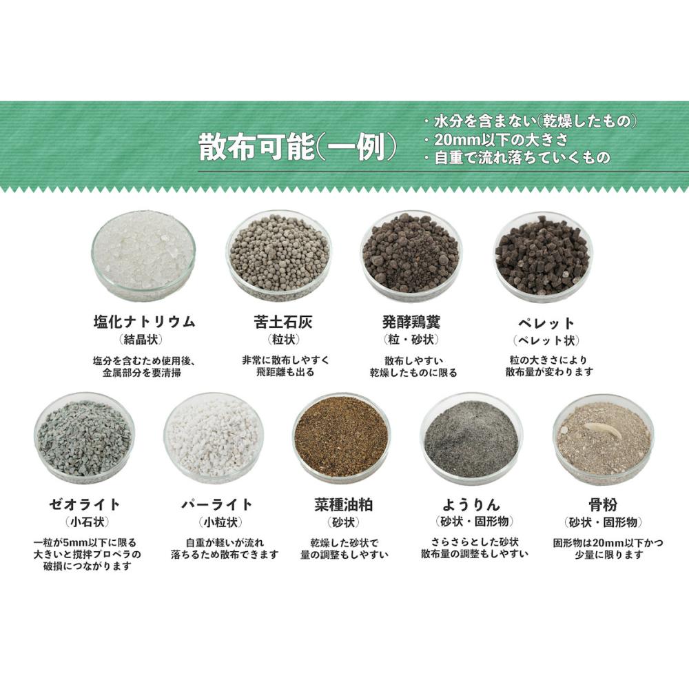 ●いろいろな台車に取付ける事で環境に応じた電動肥料散布機になります。 ●バッテリーはキャンプ等での補助電源で使用可能です。 ●本体が軽量なので、軽トラ積載も持ち上げて積載可能。現場までの移動が楽に行えます。 ●日本製造(バッテリー中国製))