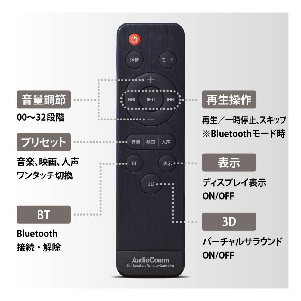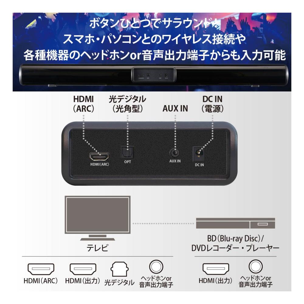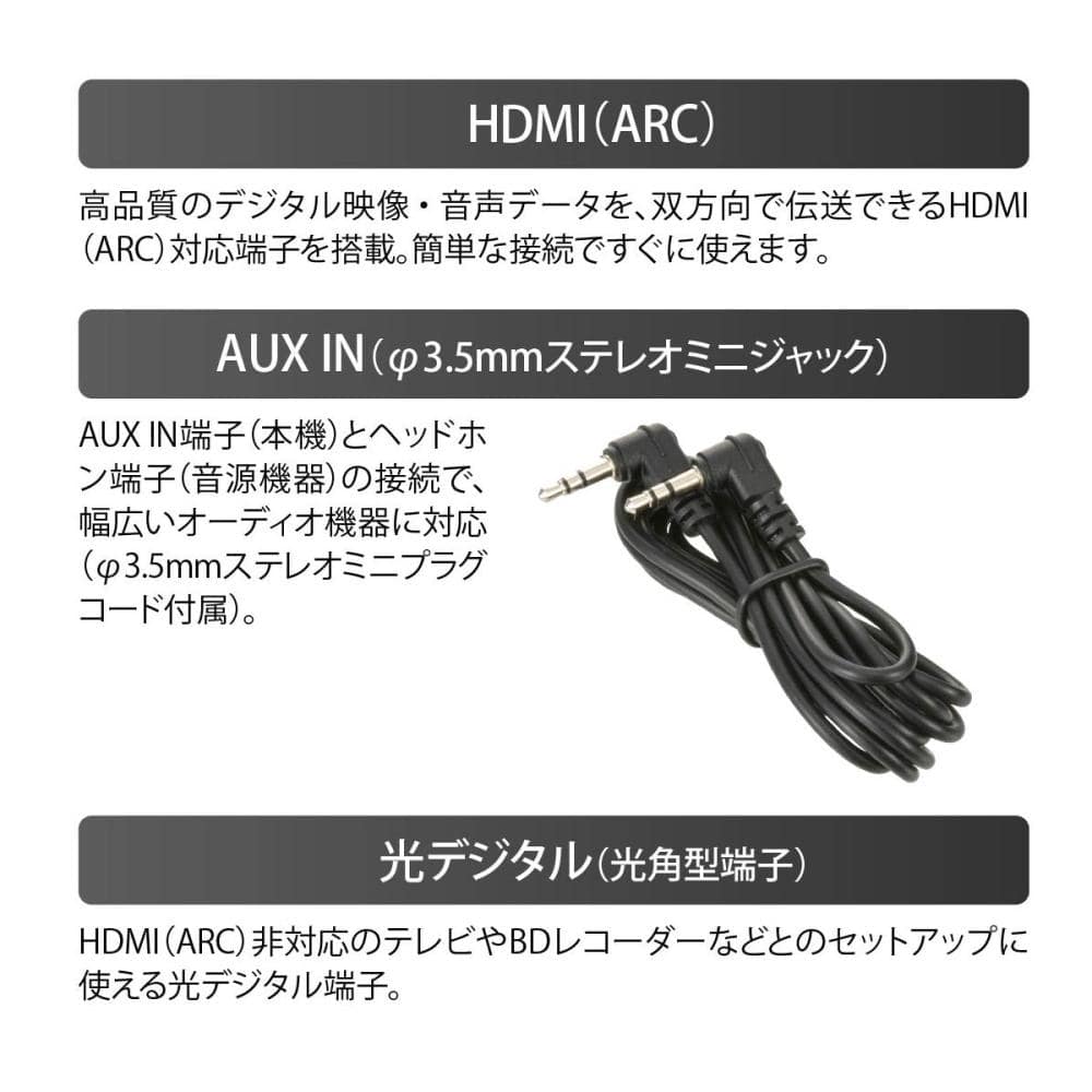 ● HDMI(ARC)でテレビと簡単接続 ● Bluetooth受信機能:スマホとワイヤレス接続!(Ver. 5.3) ●ワイドサイズ(幅85cm)から迫力のサウンド(40W) ● 口径57mmスピーカー x 2 + BassAirTube x 1 ● 3Dバーチャルサラウンド ● プリセットイコライザー 「音楽」「映画」「人声」 ● 多彩な接続方式 ・HDMI(ARC) ・光デジタル ・Bluetooth ・AUX-IN ● 専用リモコン付属