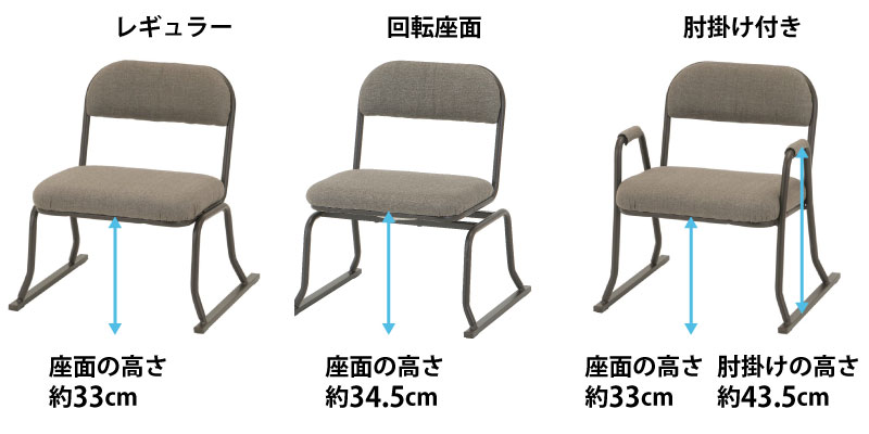 レギュラータイプ、座面回転タイプ、肘掛け付きタイプ。