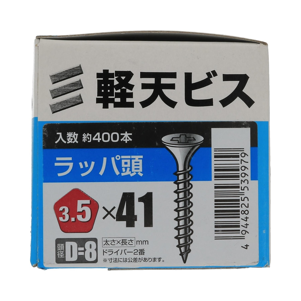 材質は鉄でユニクロめっき ラッパ形状のビス 打ち込み速度が速く、うすい鉄板に下穴をあけずに打ち込むことができます。 【入数】約400本 【サイズ】太さ3.5×長さ41mm 頭径D=8