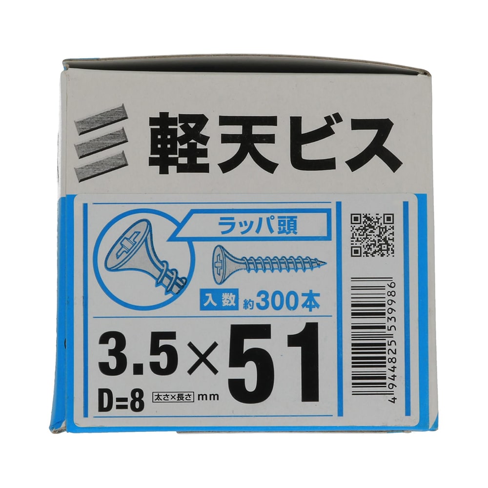 材質は鉄でユニクロめっき ラッパ形状のビス 打ち込み速度が速く、うすい鉄板に下穴をあけずに打ち込むことができます。 【入数】約300本 【サイズ】太さ3.5×長さ51mm 頭径D=8