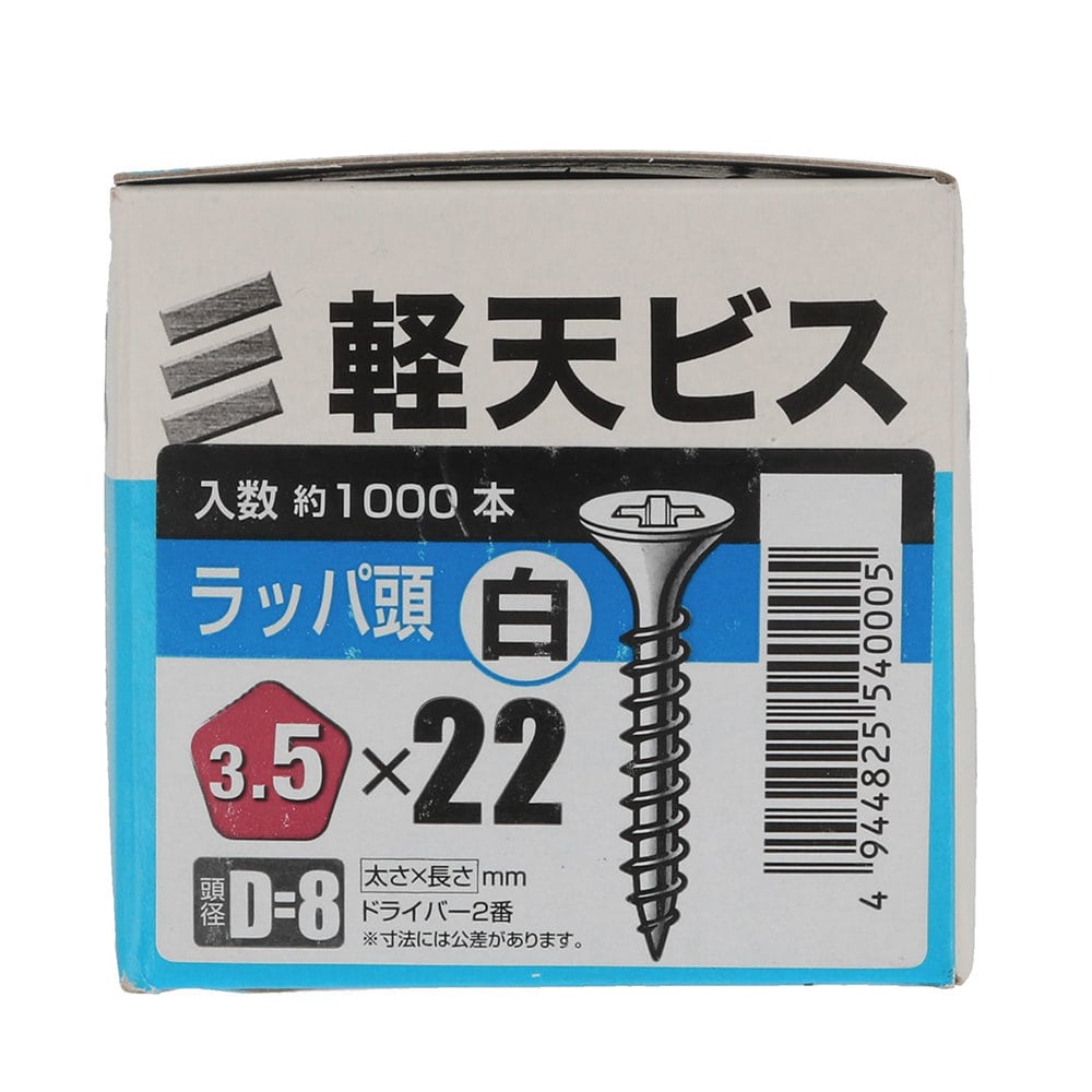 材質は鉄でユニクロめっき ラッパ形状のビス 打ち込み速度が速く、うすい鉄板に下穴をあけずに打ち込むことができます。 頭部に白色の塗装が施されています。 【入数】約1000本 【サイズ】太さ3.5×22mm 頭径D=8