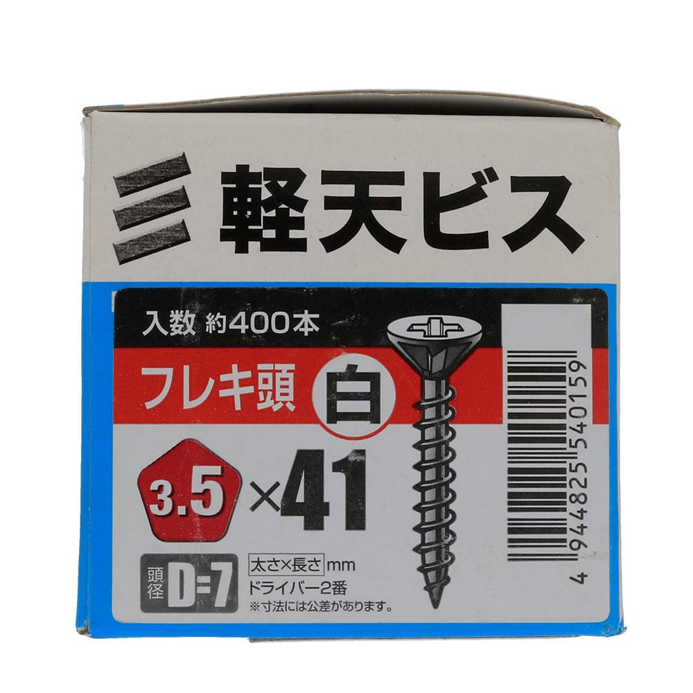 材質は鉄でユニクロめっき フレキ付きのビス 下穴不要で薄鉄板にすばやく打ち込むことができます。 頭部に白色の塗装が施されています。 【入数】約400本 【サイズ】太さ3.5×長さ41mm 頭径D=7