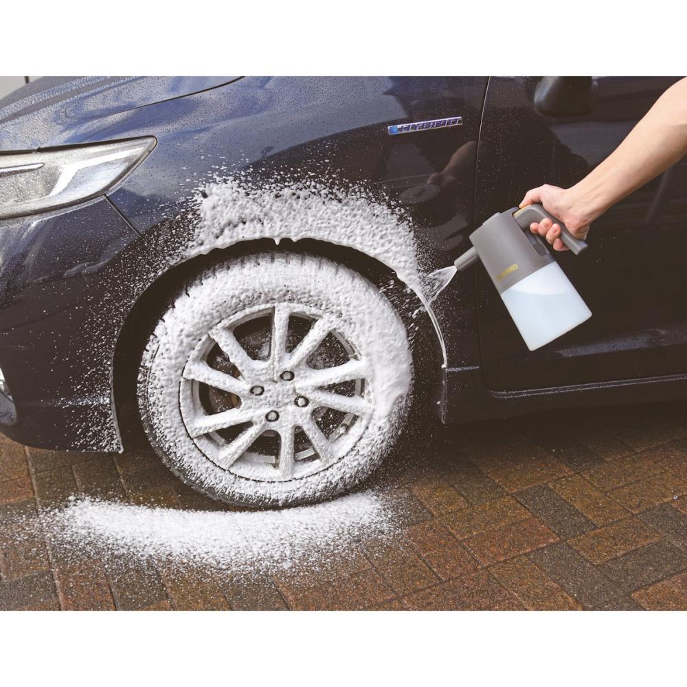 ・カーシャンプーを希釈してボトルに入れ、ボタンを押すだけですぐに泡洗車できる