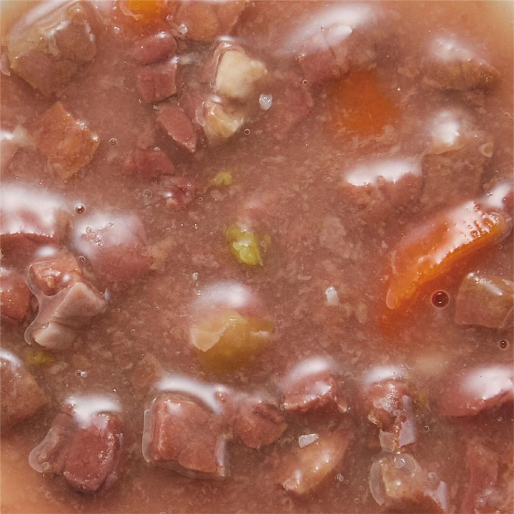 原材料・成分:肉類(牛)、野菜類(グリンピース・にんじん)、ビーフエキス、増粘安定剤(グァーガム・キサンタンガム)