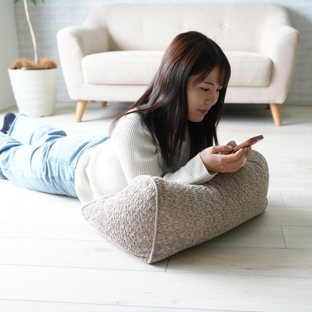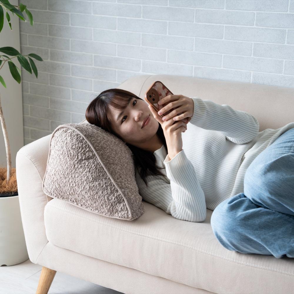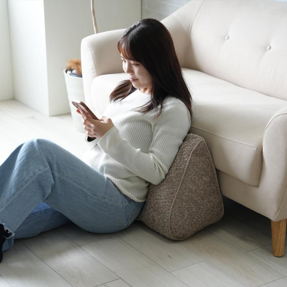 ■置き方次第で色々使える三角形クッション。背当て、肘置き、枕にも。