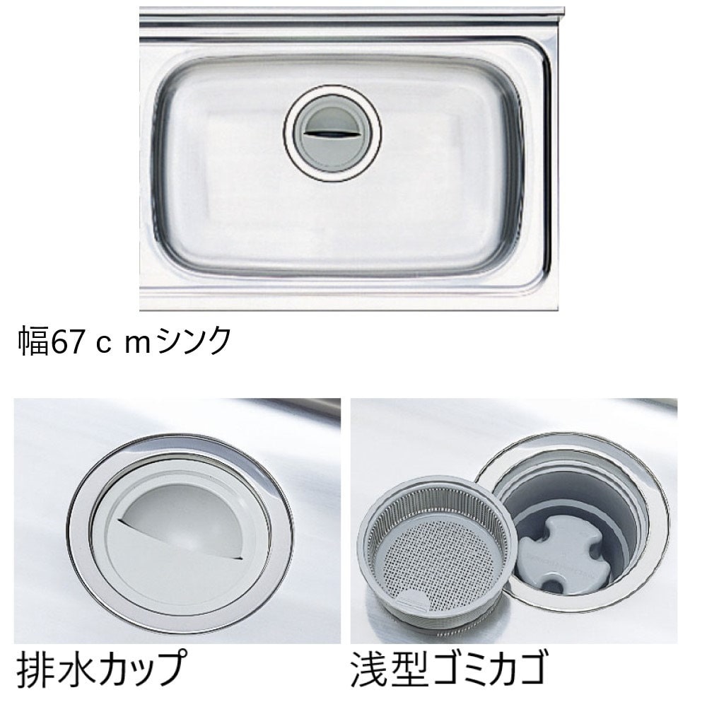 ●仕様:流し台●シンク:幅67cm(点検口付)●扉色:ミドルペア●扉材:EBコートアクリル系化粧パーティクルボード●上板(トップ):ステンレス