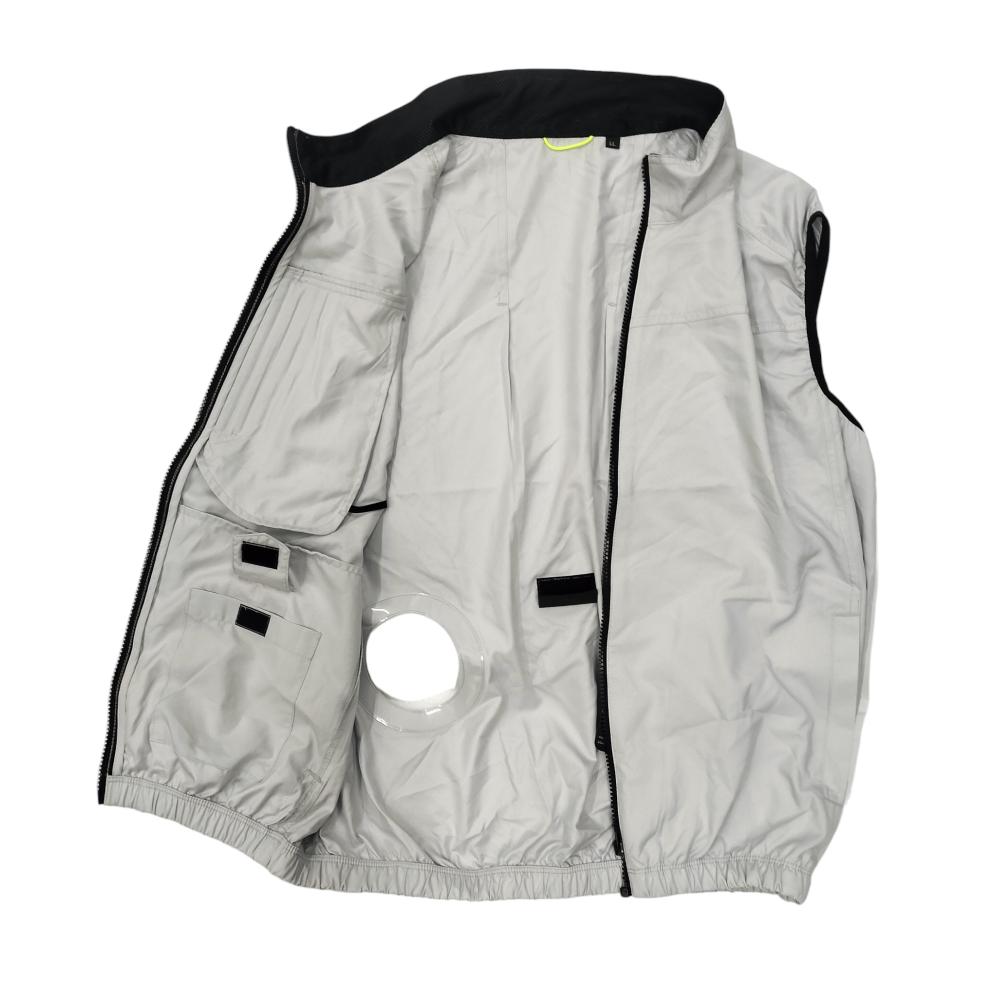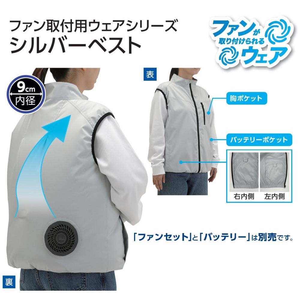 ●ファン取り付け部内径9cm。 ※サイズの合わないファンは、使用できません。 ファンの落下や、故障の原因になります。 ●両内側にバッテリーポケット。 ●左胸ポケット。