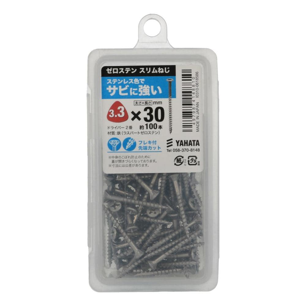 【特徴】ユニクロめっきの10倍の耐食性(ユニクロめっき木用ねじとの耐食性試験による比較(従来品比)。環境にやさしいクロムフリー。 【入数】100本 【材質】鉄(ラスパートゼロステン) 【サイズ】太さ3.3×長さ30mm