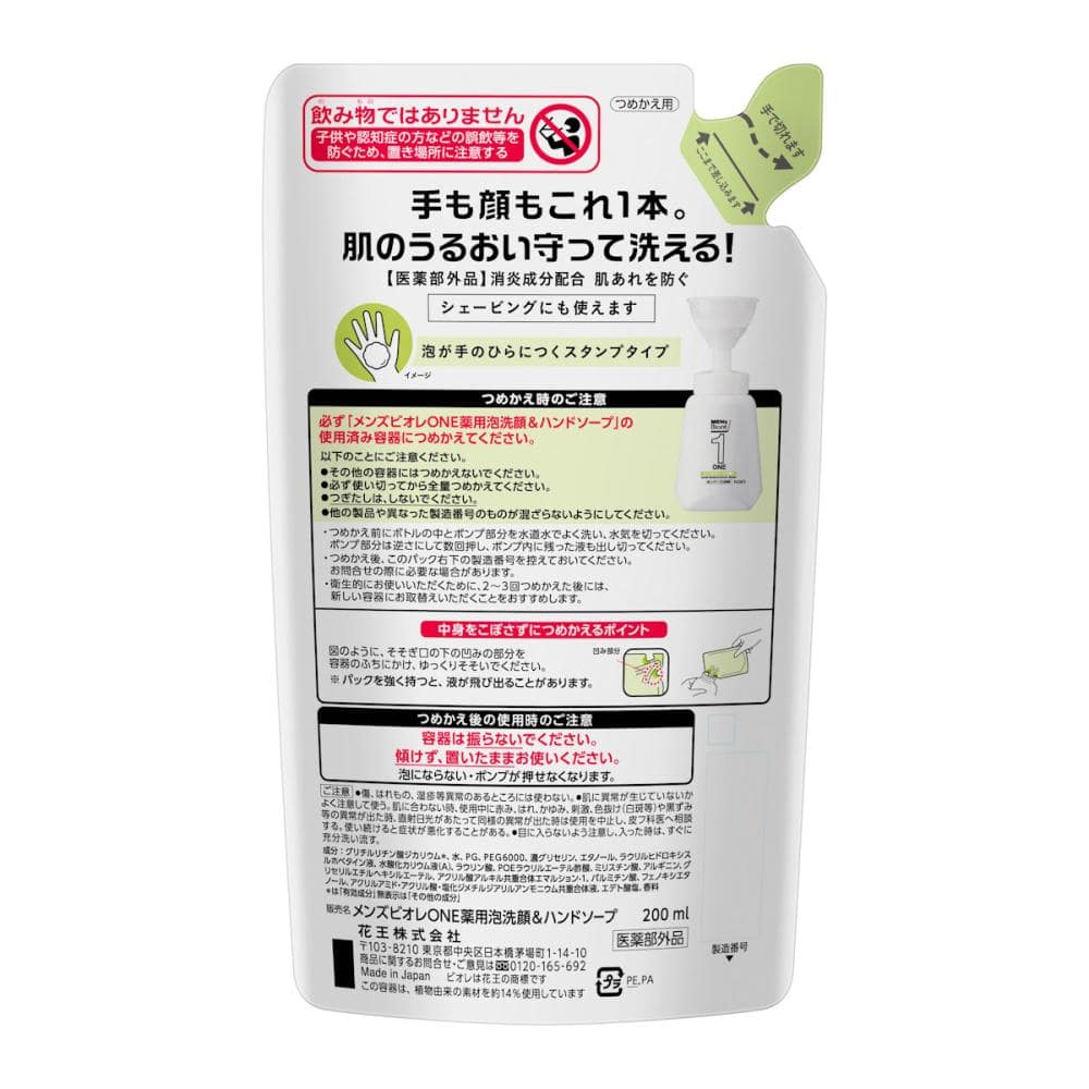 使用上の注意:つめかえ時のご注意 必ず「メンズビオレONE薬用泡洗顔&ハンドソープ」の使用済み容器につめかえてください。 以下のことにご注意ください。 ●その他の容器にはつめかえないでください。 ●必ず使い切ってから全量つめかえてください。 ●つぎたしは、しないでください。 ●他の製品や異なった製造番号のものが混ざらないようにしてください。 ・つめかえ前にボトルの中とポンプ部分を水道水でよく洗い、水気を切ってください。ポンプ部分は逆さにして数回押し、ポンプ内に残った液も出し切ってください。 ・つめかえ後、このパック右下の製造番号を控えておいてください。お問合せの際に必要な場合があります。 ・衛生的にお使いいただくために、2~3回つめかえた後には、新しい容器にお取替えいただくことをおすすめします。 つめかえ後の使用時のご注意 容器は振らないでください。 傾けず、置いたままお使いください。 泡にならない・ポンプが押せなくなります。 ご注意 ●傷、はれもの、湿疹等異常のあるところには使わない。 ●肌に異常が生じていないかよく注意して使う。