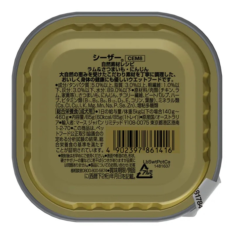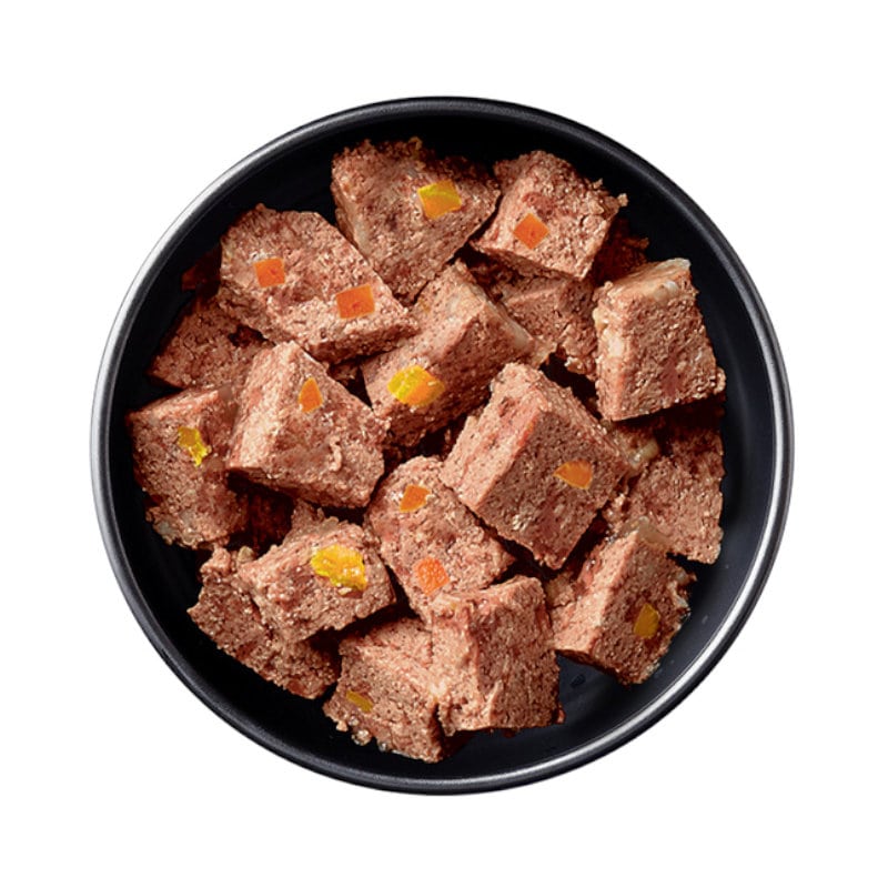 原材料・成分:肉類(チキン、ラム等)、野菜類(にんじん等)、さつまいも、チコリー繊維、ビートパルプ、ハーブ、ビタミン類(B1、B5、B6、B12、D3、E、コリン、葉酸)、ミネラル類(Ca、Cl、Cu、I、K、Mg、Mn、Na、P、Se、Zn)、増粘多糖類